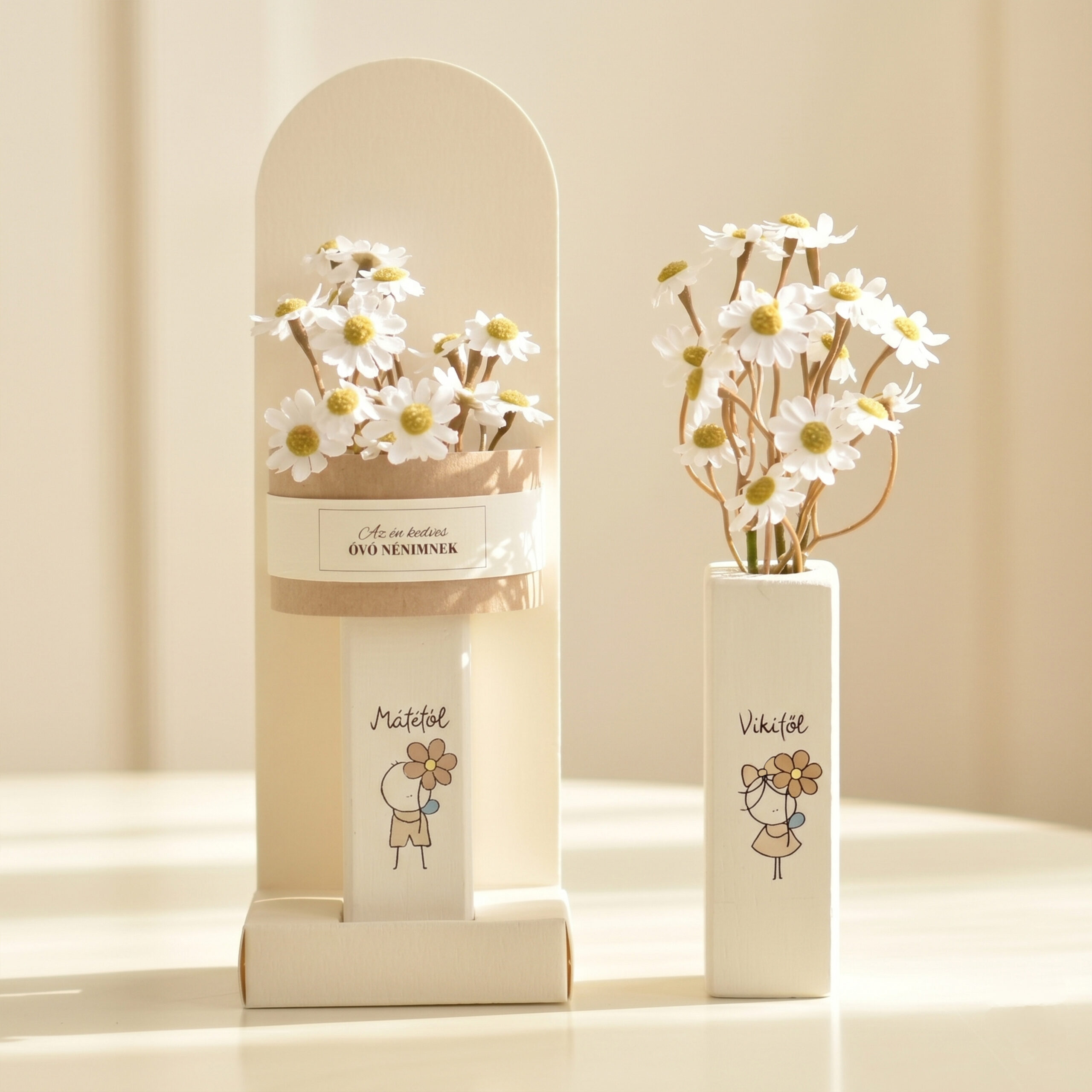 Ajándék pedagógusoknak – fa virágtartó egyedi rajzzal
