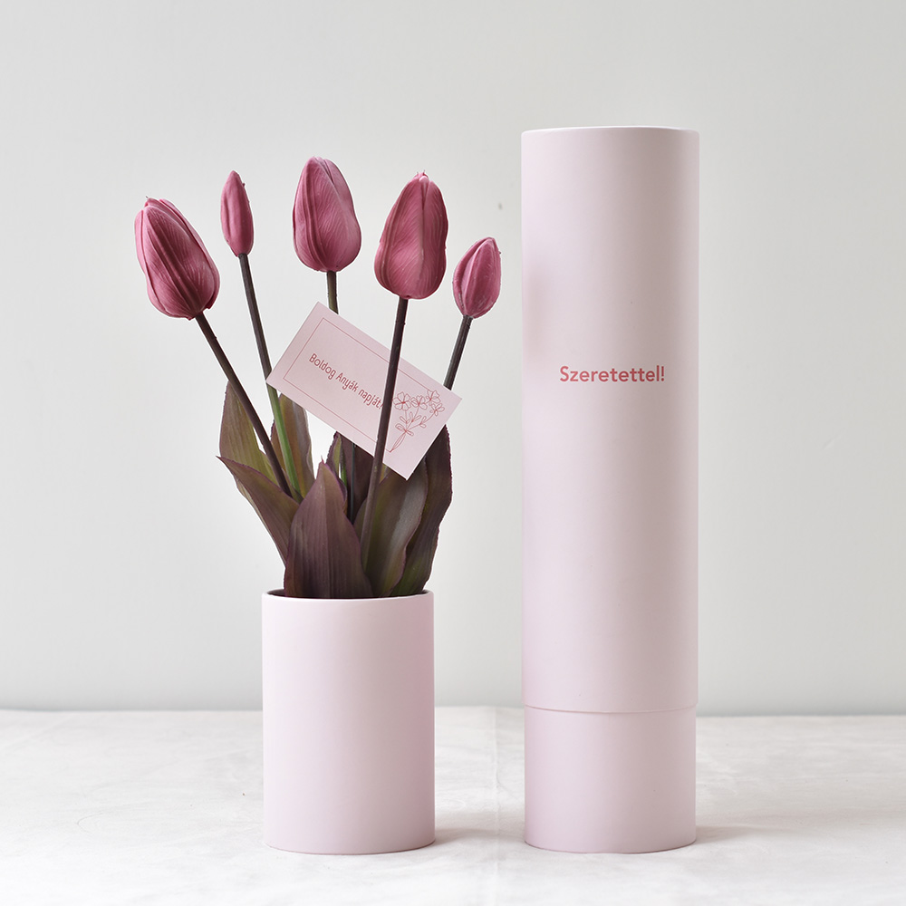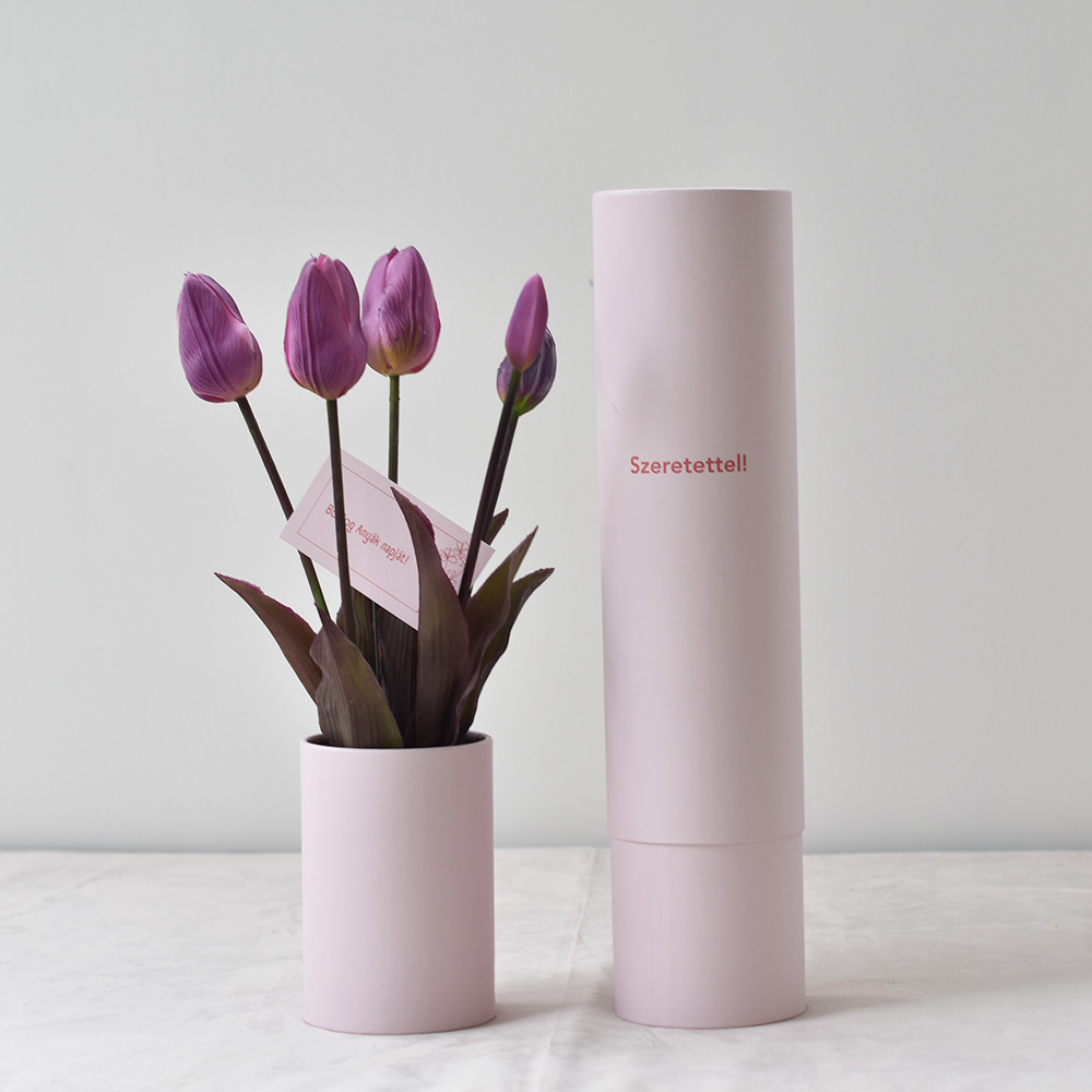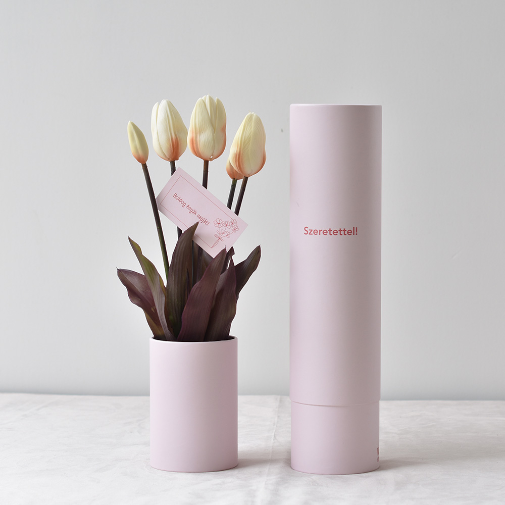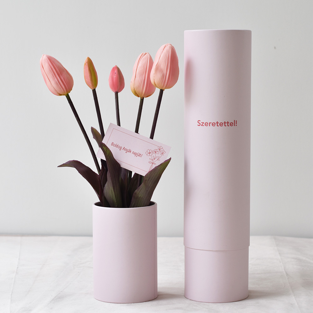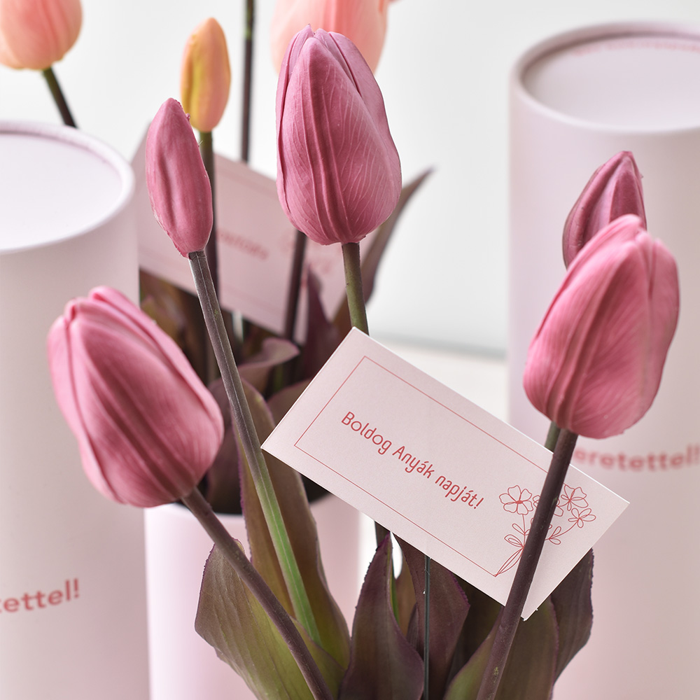 Letisztult, elegáns anyák napi ajándék ez a díszdoboz finom pasztell színekben, tulipáncsokorral. Stílusos csomagolás, amely dekorációként is megállja a helyét. Tökéletes választás anyák napjára.