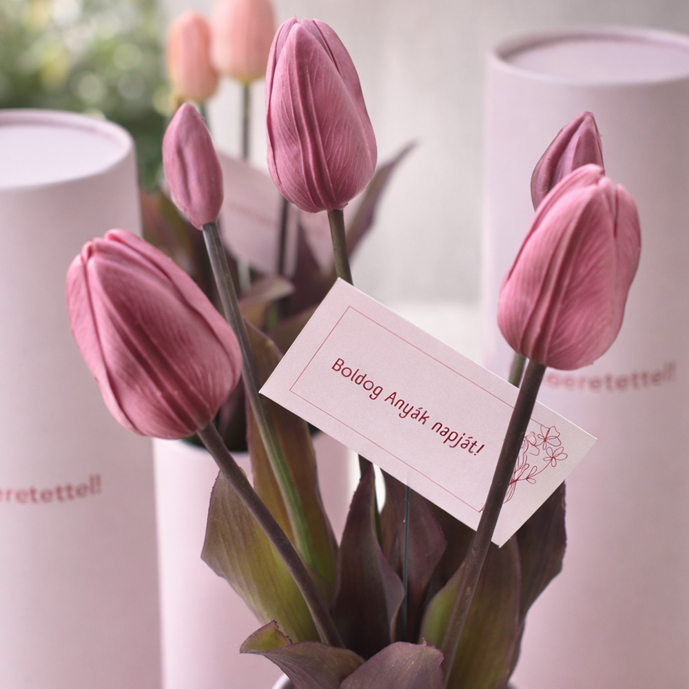 Az átgondolt kialakítás teszi igazán különlegessé: a tető levétele után a doboz alsó része stabil tartóként funkcionál, így a kompozíció tovább él a térben, és nap mint nap emlékeztet egy szép pillanatra. A tulipánok friss, tavaszi hangulatot visznek a környezetbe, a finom színvilág pedig nyugalmat és harmóniát sugároz.