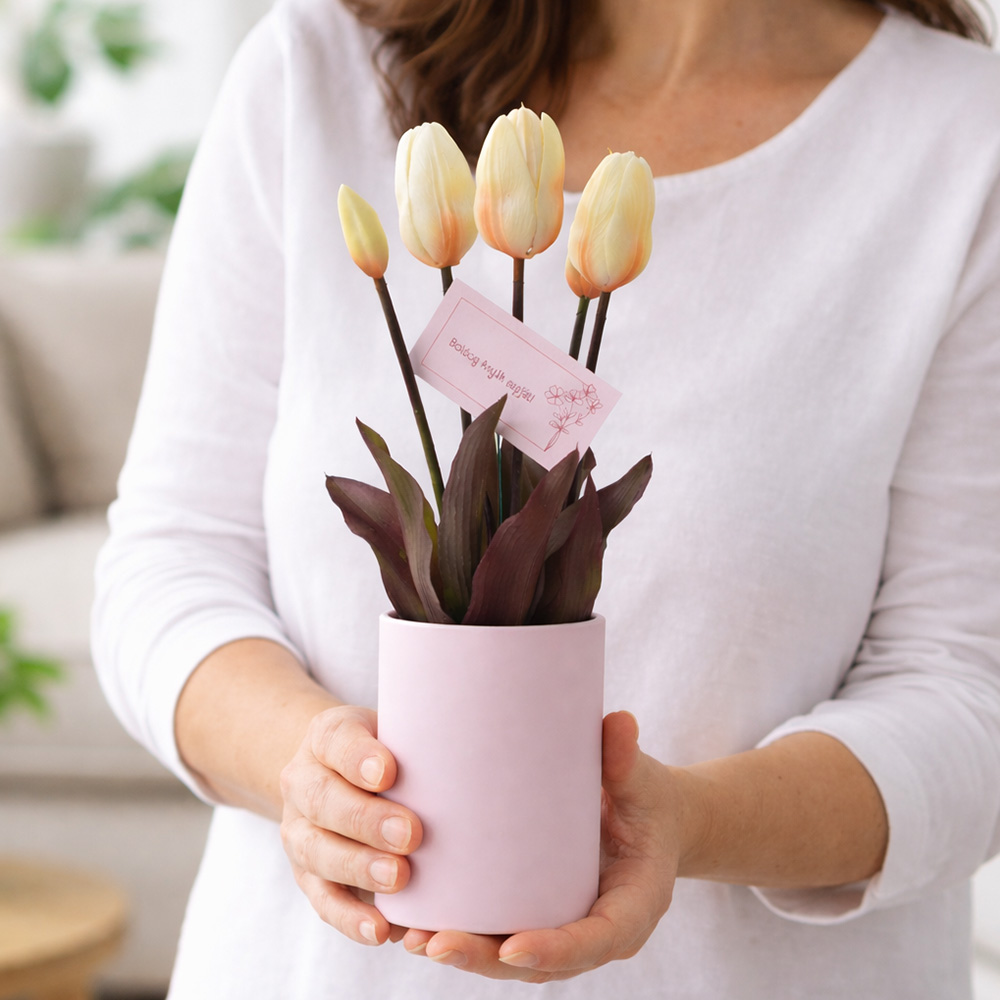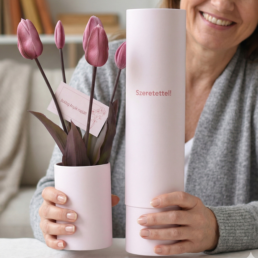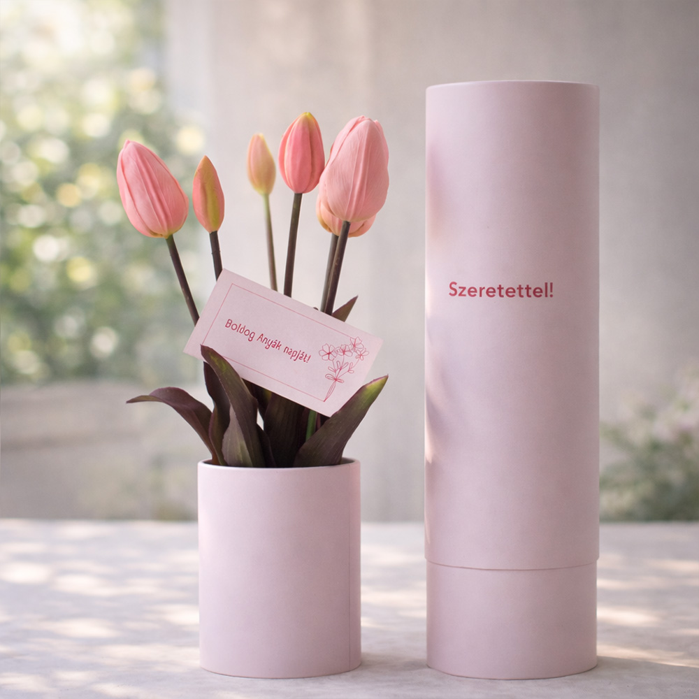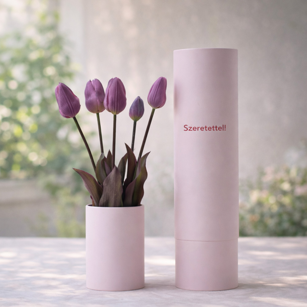 Ez a henger formájú, pasztell árnyalatú ajándékdoboz finom, harmonikus megjelenésével és a benne elhelyezett tulipáncsokorral igazán elegáns meglepetés. Letisztult stílusa miatt bármilyen otthonba könnyedén beilleszthető, nemcsak ajándékként, hanem tartós dekorációként is megállja a helyét.