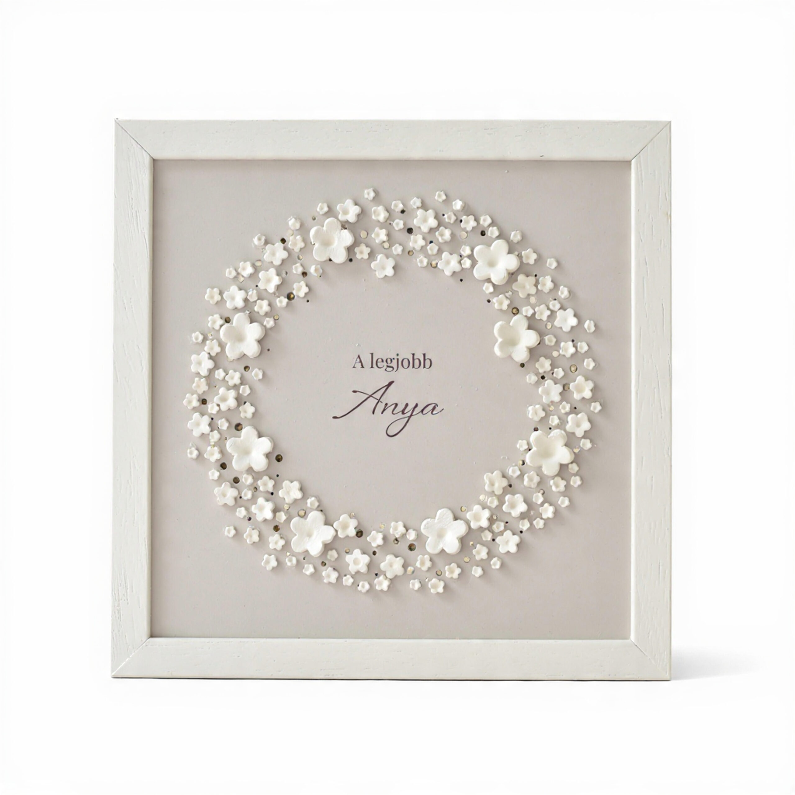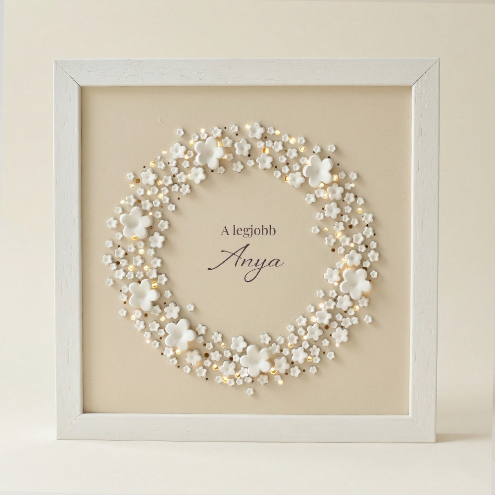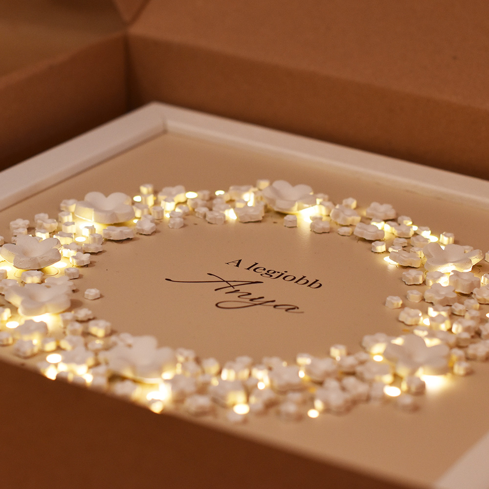 Ez a különleges Anyák napi ajándék egy ízléses dekoráció is, amely minden stílusú otthonba illik. Több, mint egy egyszerű képkeret: kézzel készült, aprólékosan kidolgozott virágokkal, személyre szabható feliratával és hangulatvilágításával igazán különleges ajándék. A gondosan összeállított virágkoszorú a mélységének köszönhetően térben is kiemelkedik, a középen elhelyezett személyes üzenet pedig pontosan azokat szólítja meg, akik a legfontosabbak számunkra. A virágok textúrája és elrendezése minden darabnál egyedi, így biztos lehetsz benne, hogy megismételhetetlen ajándékot adsz át!