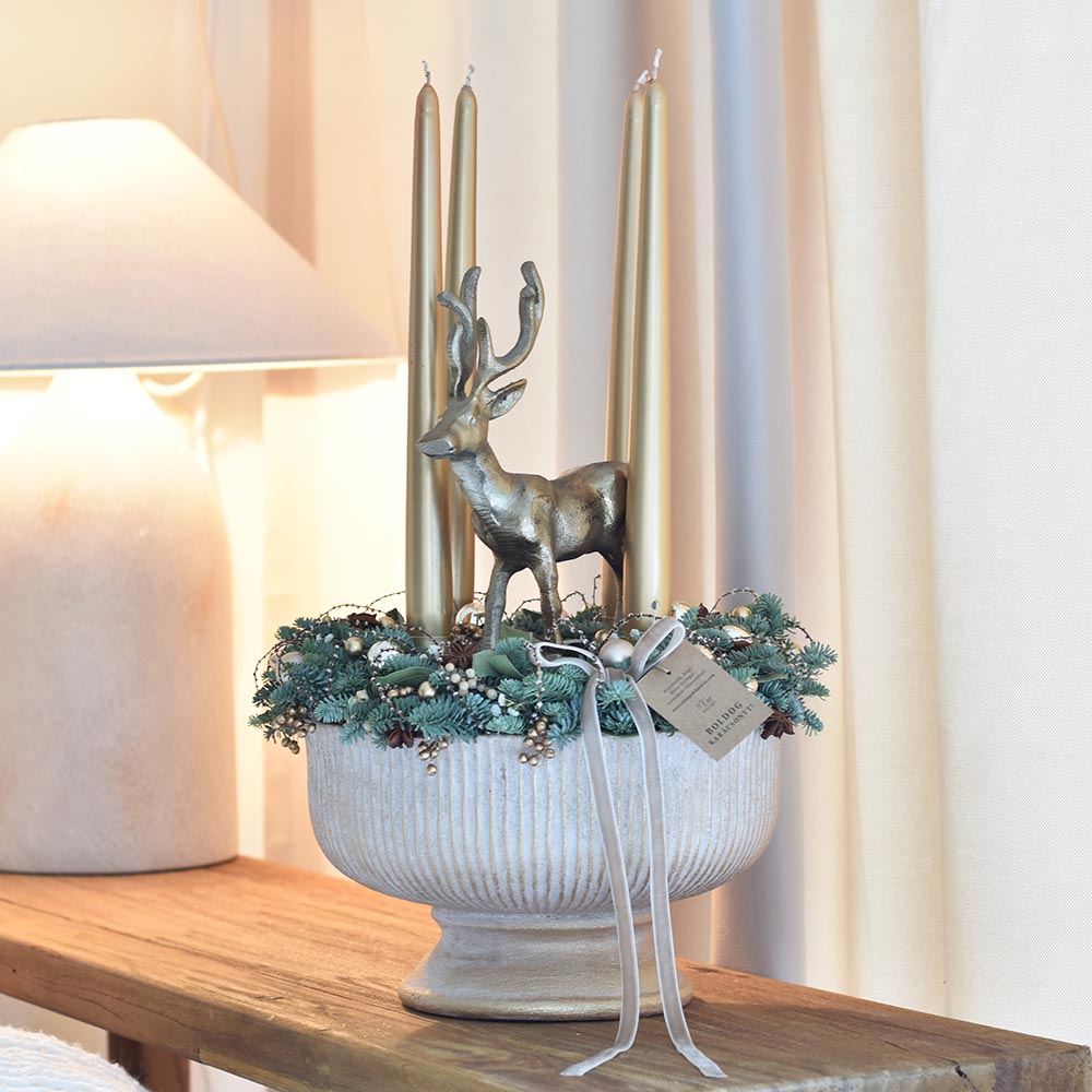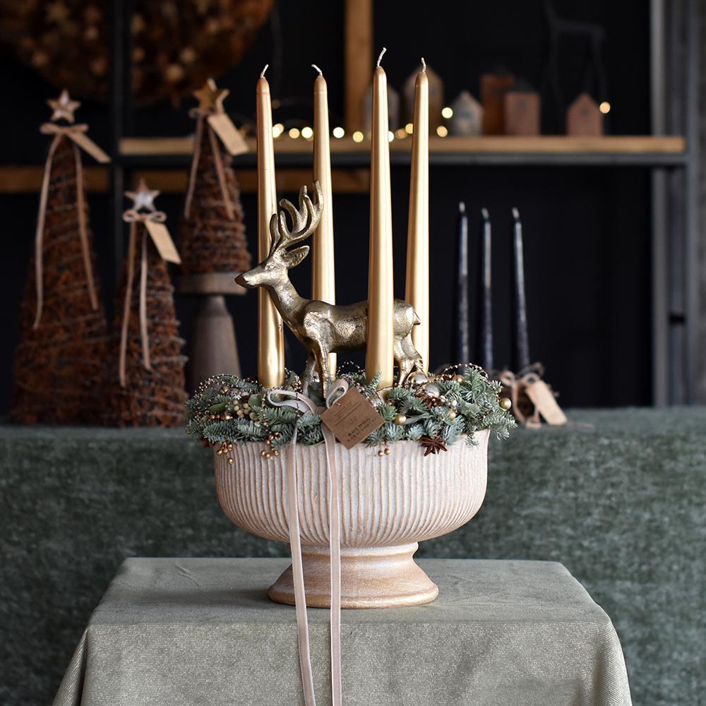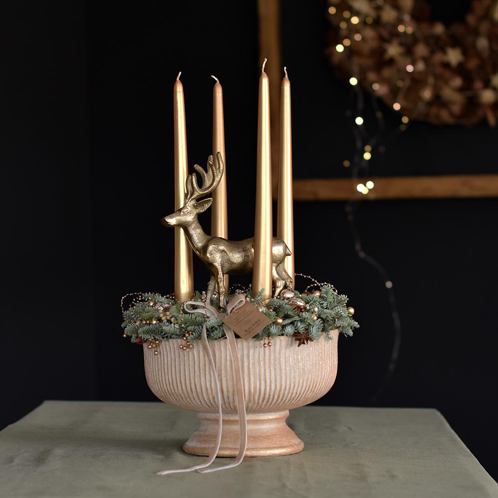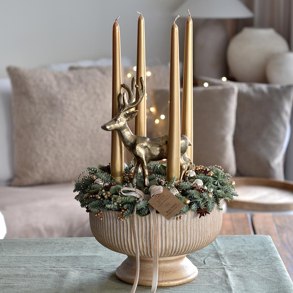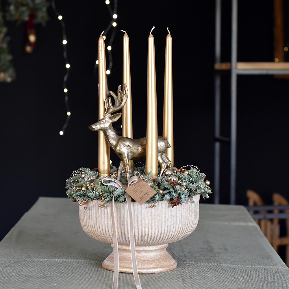 Az alapját friss, élő nobilis fenyő adja, melynek középpontjában egy arany szarvas áll, körülötte négy karcsú gyertyával.