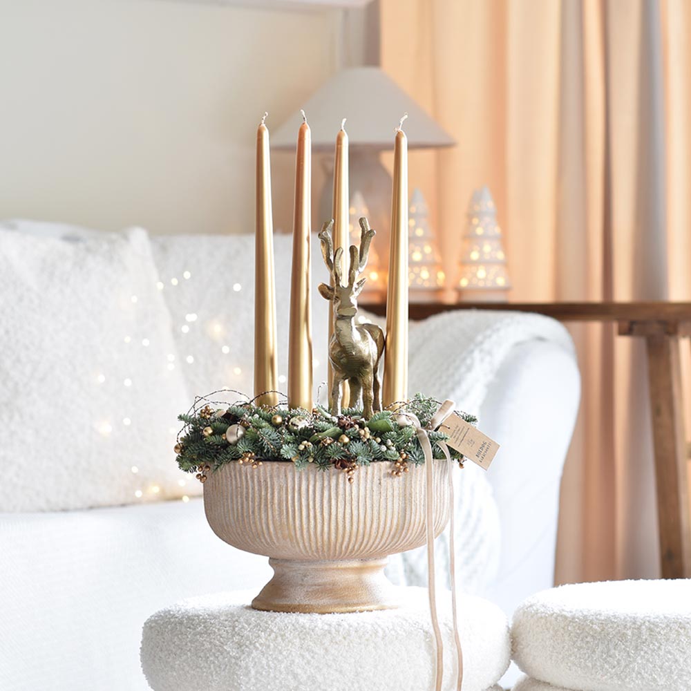 Ez az arany adventi asztaldísz igazán látványos a nagyméretének köszönhetően. A kompozíció egy különleges, bordázott felületű, enyhén aranyozott és bézs árnyalatú kaspóban kapott helyet.