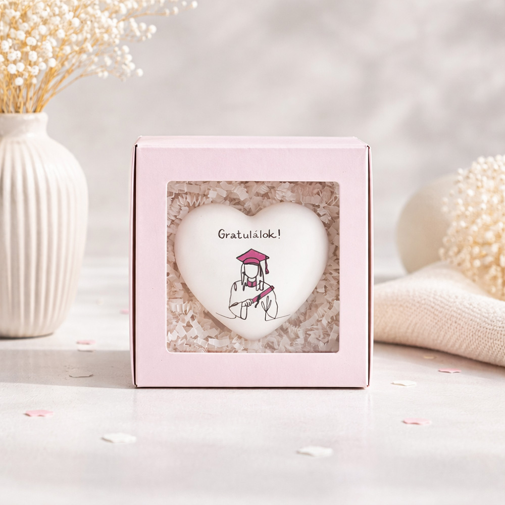 Ez az elegáns, rózsaszín díszdobozos szív tökéletes meglepetés minden ballagó vagy diplomázó lánynak, aki megérdemel egy különleges, maradandó emléket. A plexi ablakos dobozban elhelyezett kerámiaszív választható grafikával és felirattal érkezik. Választható „Ballagásodra” vagy „Diplomaosztódra” , vagy akár személyre szabott szöveget is kérhetsz rá (maximum 2 szóig), így még személyesebb lehet az ajándék.