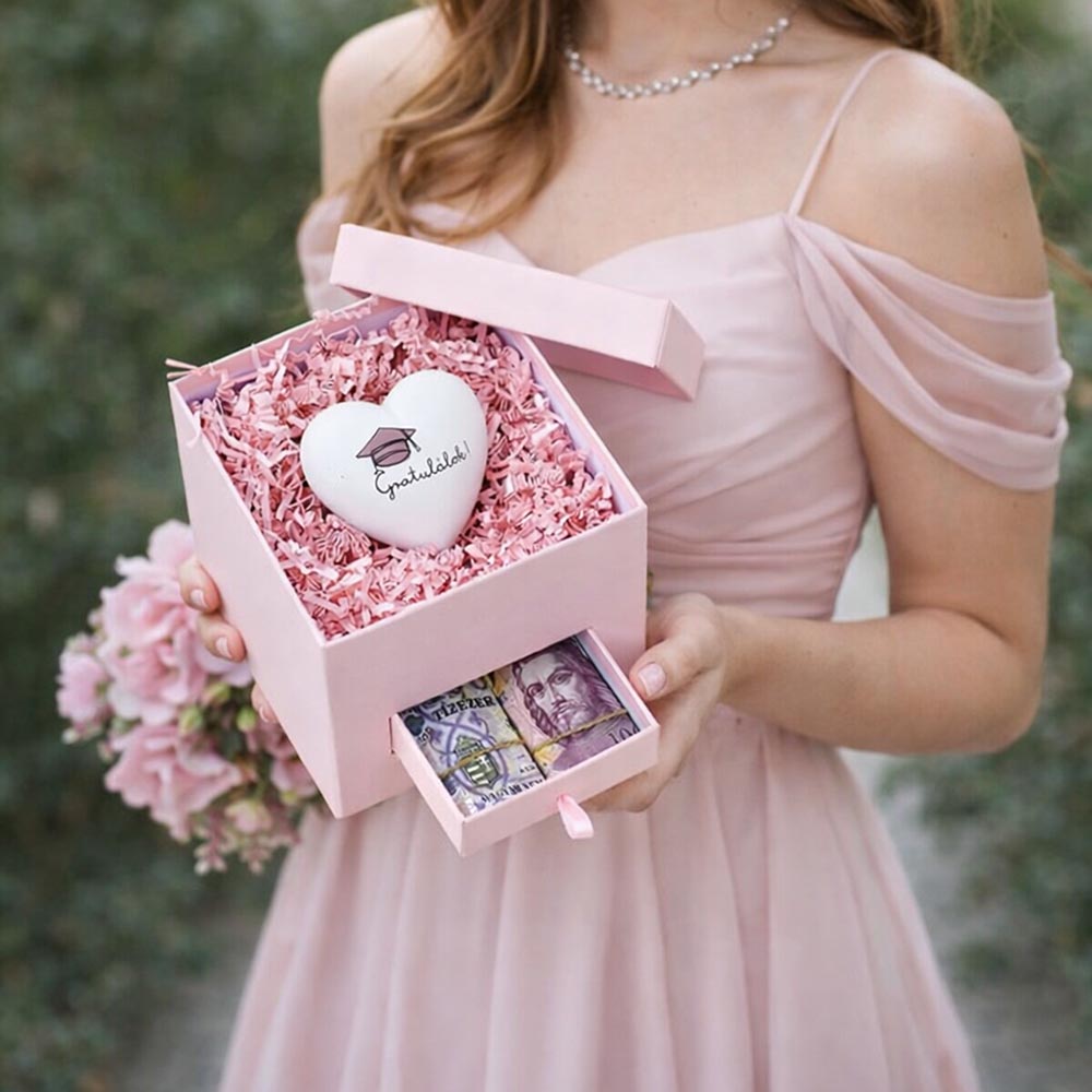 Ballagási ajándék lányoknak – rózsaszín pénztartó doboz