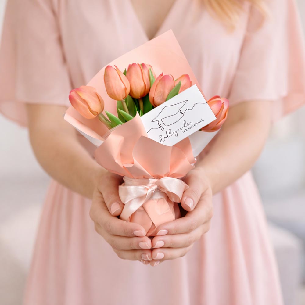 Tartós, elegáns ballagási csokor barack színű mű tulipánokból, amely örök emlékként megmarad.