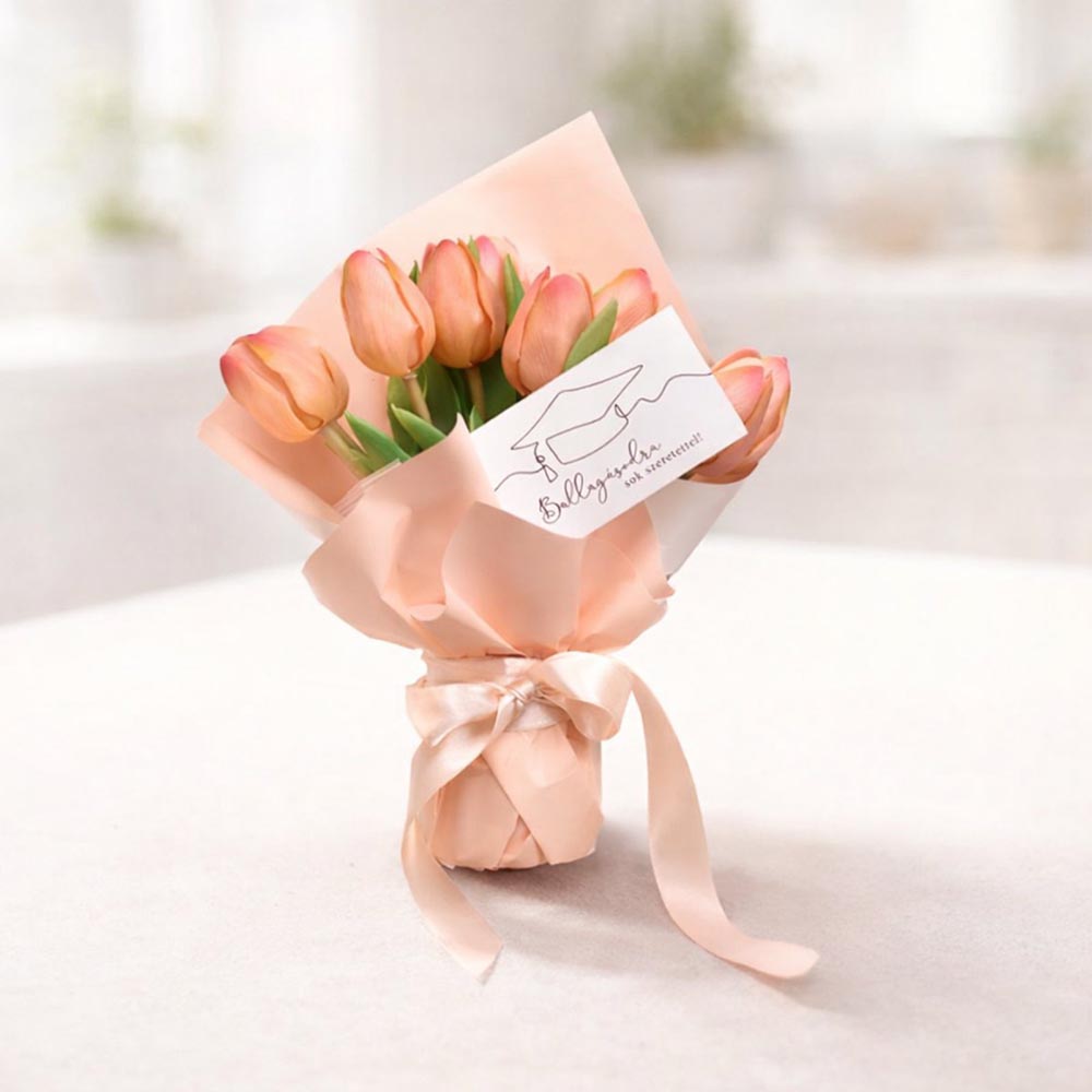A barack színű tulipán csokor a kedvességet, az új kezdetet és a figyelmességet jelképezi, ideális meglepetés egy fontos életszakasz lezárására.