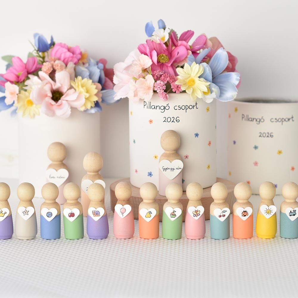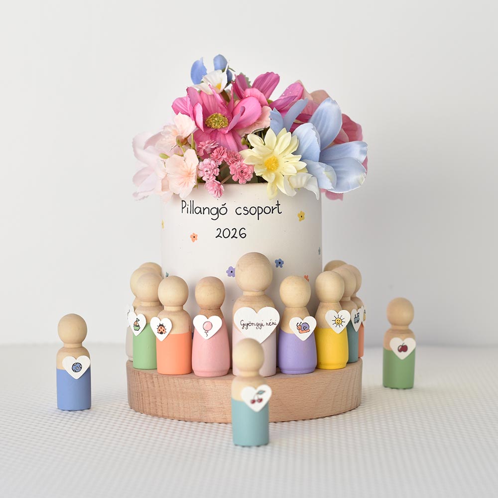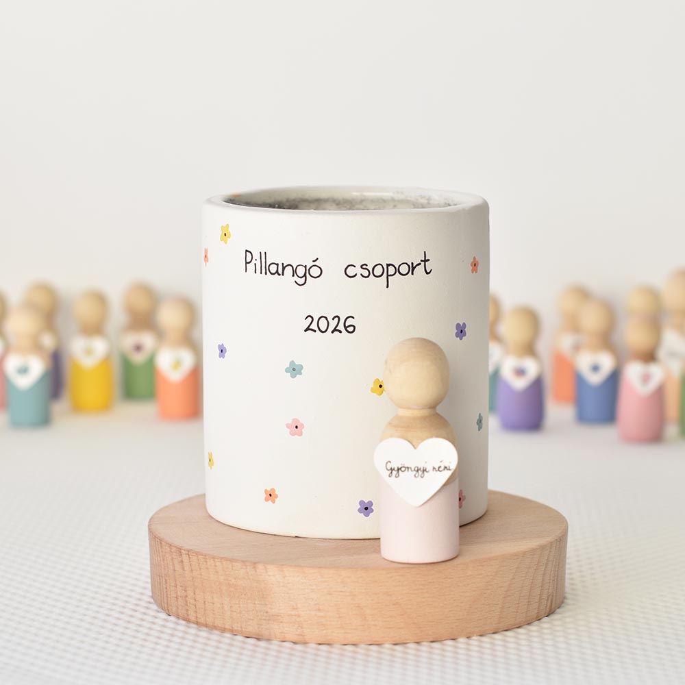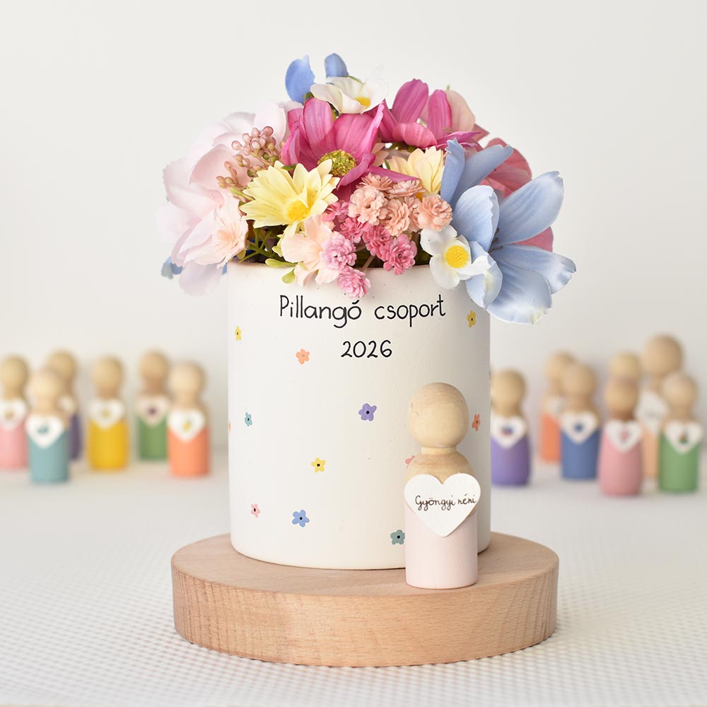 Lepjétek meg az óvó nénit vagy a tanító nénit egy igazán szívhez szóló, kézműves évzáró ajándékkal! A fehér kaspó köré helyezett, színes, személyre szabható fabábukon a gyerekek becenevei jelennek meg, így minden kisgyermek képviseltetheti magát az ajándékban.