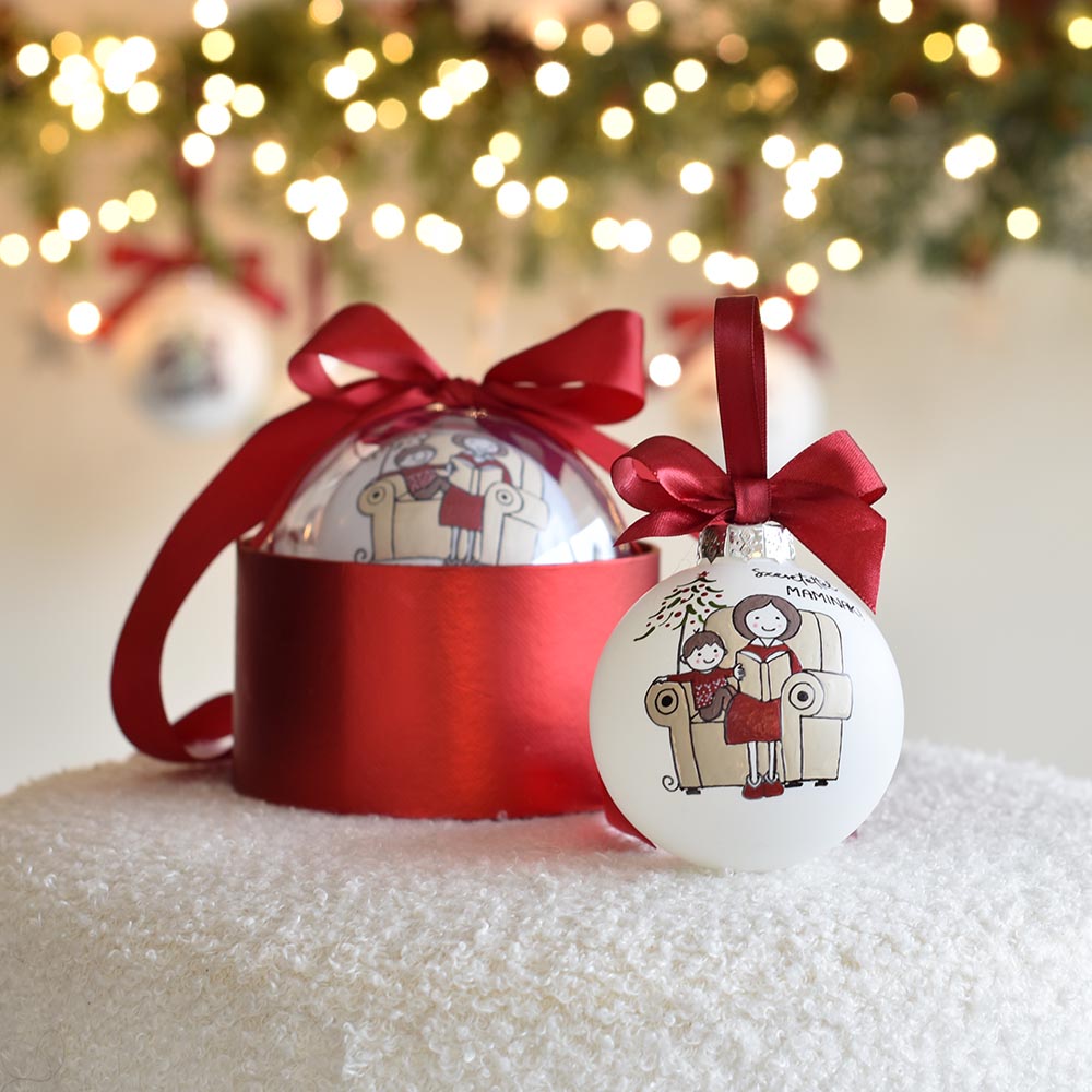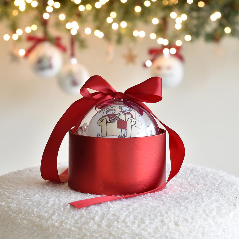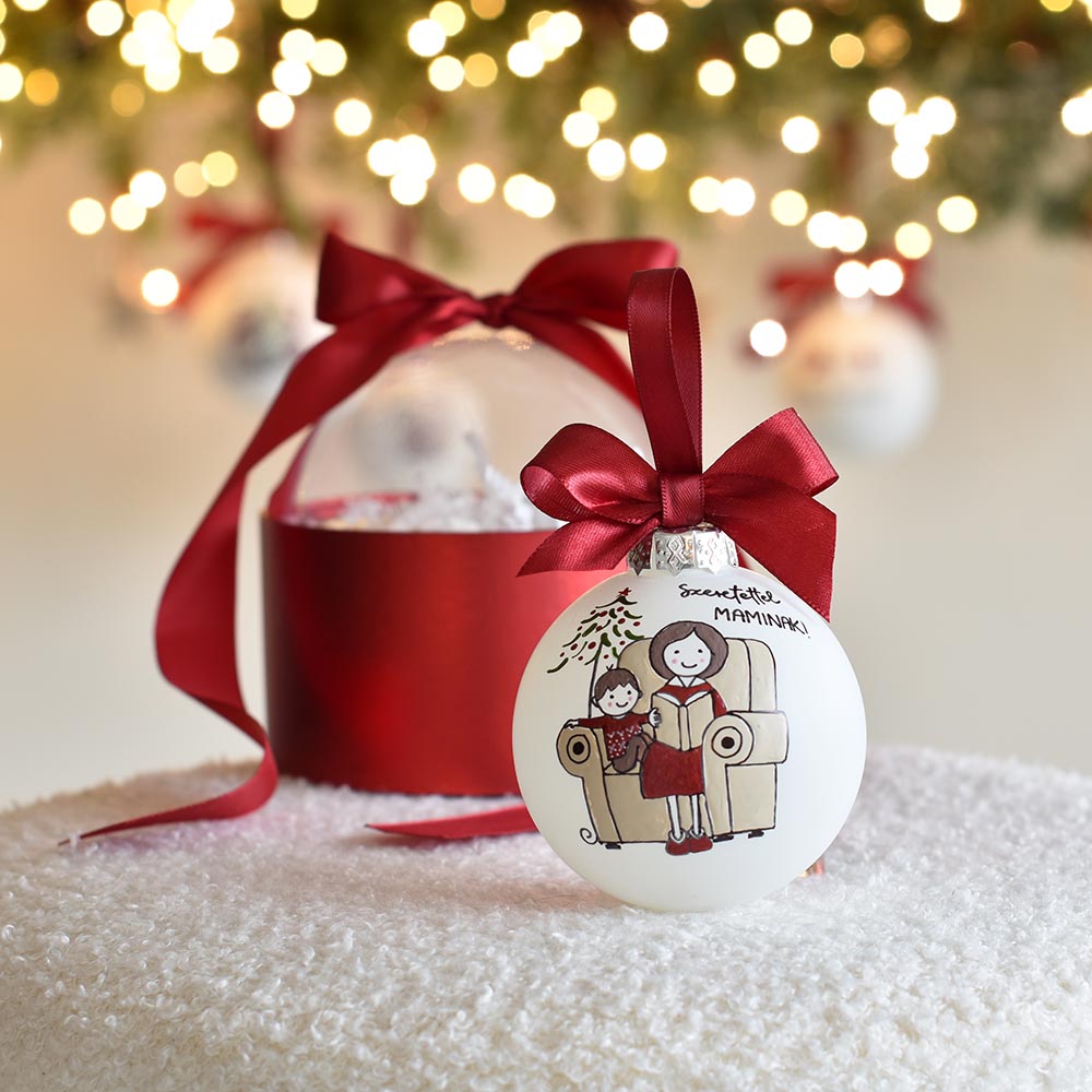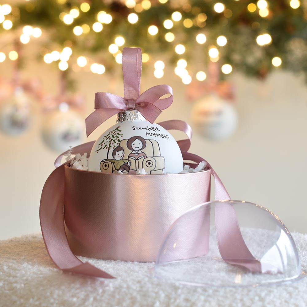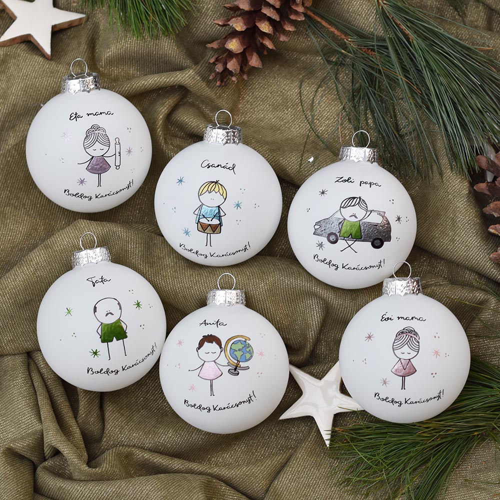 Karácsonyi üveggömbünk kézzel írott és rajzolt, egy szép ezüst szatén szalag teszi ünnepibbé. Tökéletes karácsonyi ajándéknak is, bárki számára!