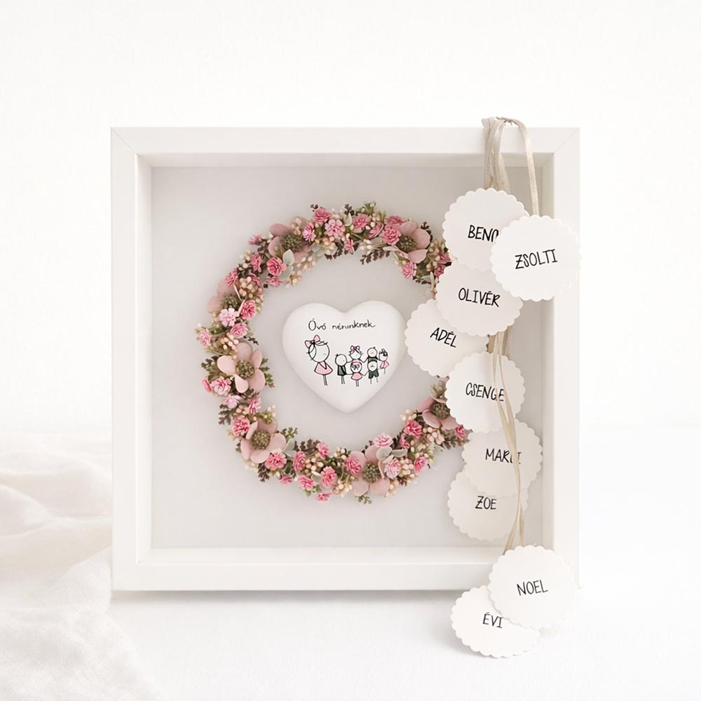 A finom virágokból készült koszorú közepén egy egyedileg kérhető fehér szív található, amely felirattal és grafikával személyre szabható. A beépített LED világítás meghitt hangulatot teremt, így nemcsak ajándék, hanem dekoráció is.