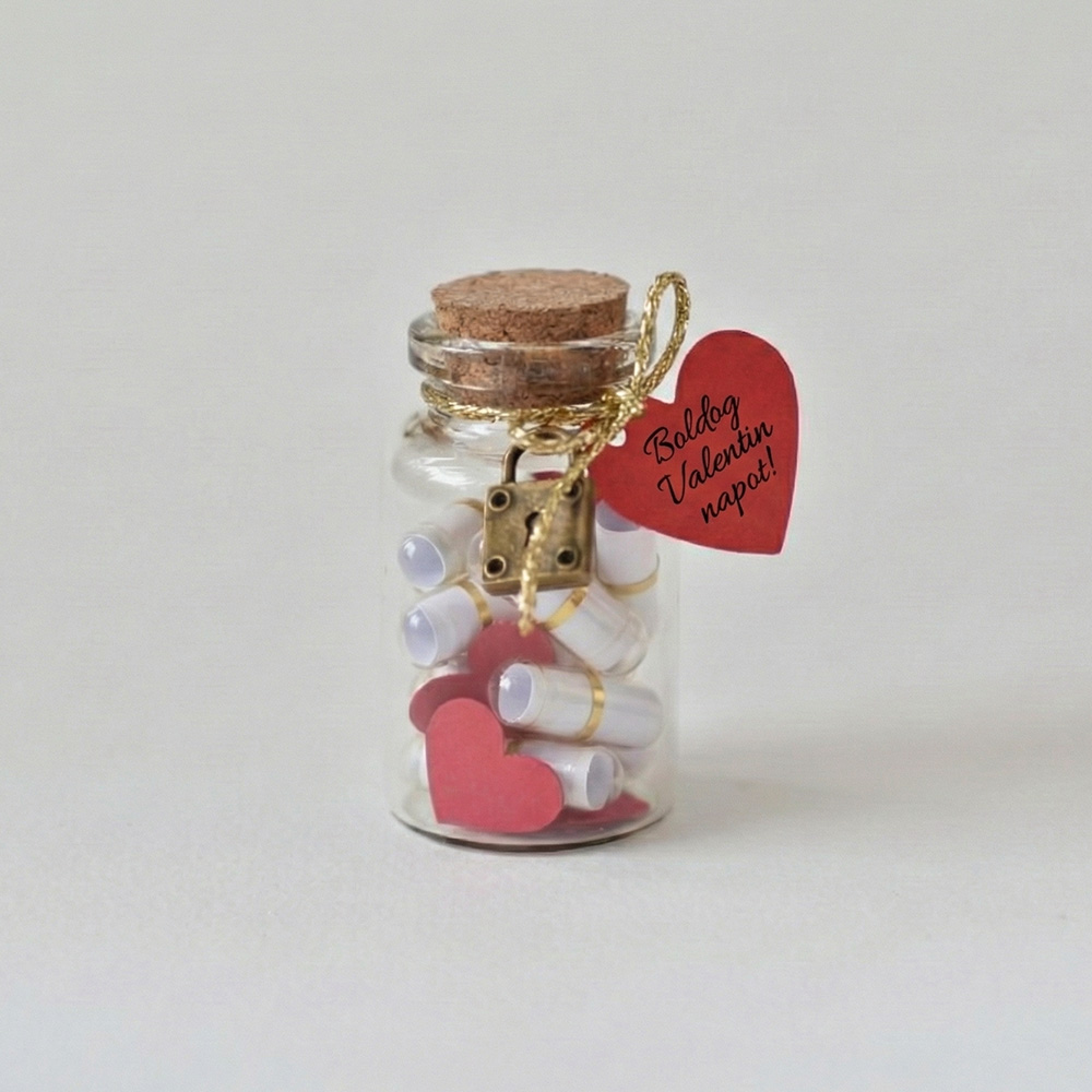 Lepd meg párodat egy különleges és romantikus Valentin-napi ajándékkal! Ez a dekoratív üvegcsés ajándék lehetőséget nyújt arra, hogy saját szavaiddal fejezd ki érzéseidet, miközben stílusos és egyedi megjelenést kínál.