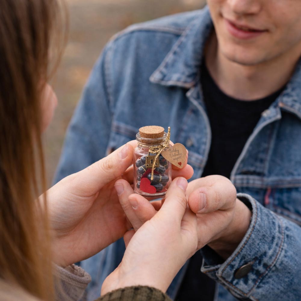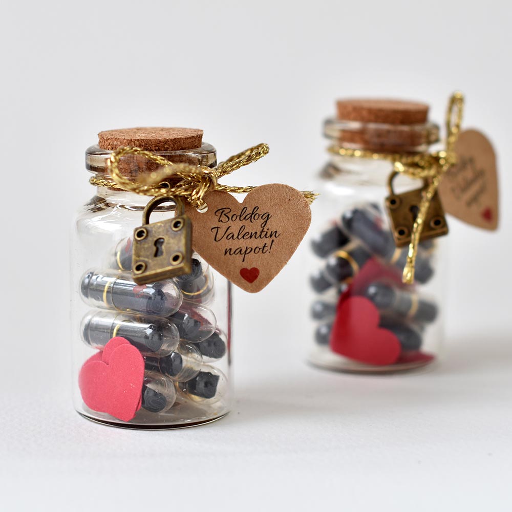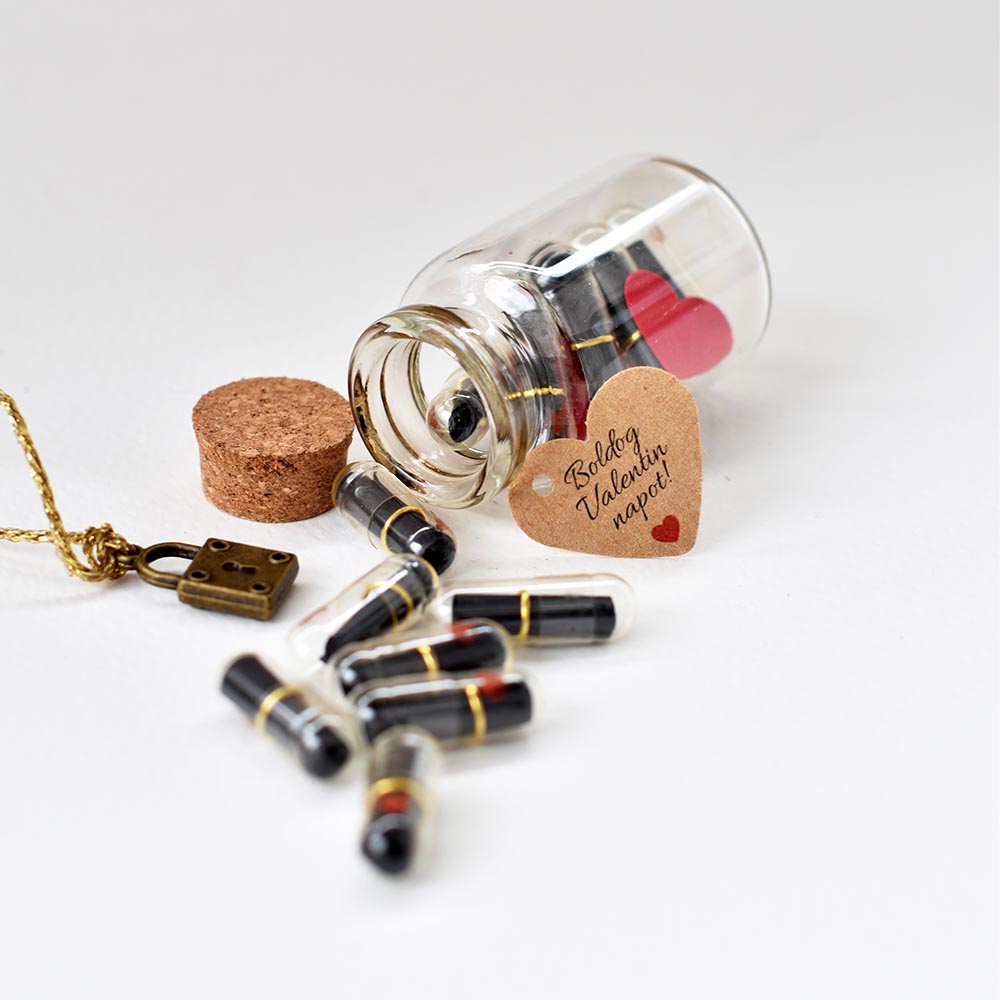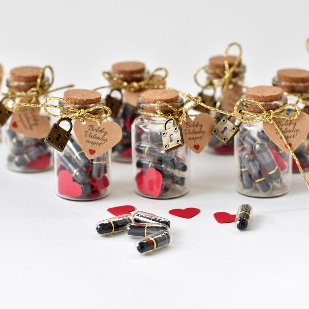 Ez a Valentin-napi üzenetes üvegcsés ajándék egyszerre kreatív és megható, tökéletesen kifejezi, hogy mit érzel. Válaszd ki a kapszulák papírjának színét, írd meg az üzeneteidet, és készíts egyedi ajándékot, amely örök emlékké válik szerelmed számára!