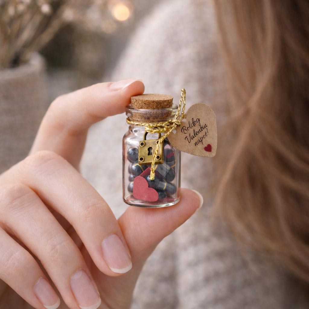 - Kompakt méret: Az üveg mérete 5 cm x 3 cm – kicsi, de megható ajándék, amelyben a tartalom számít igazán.