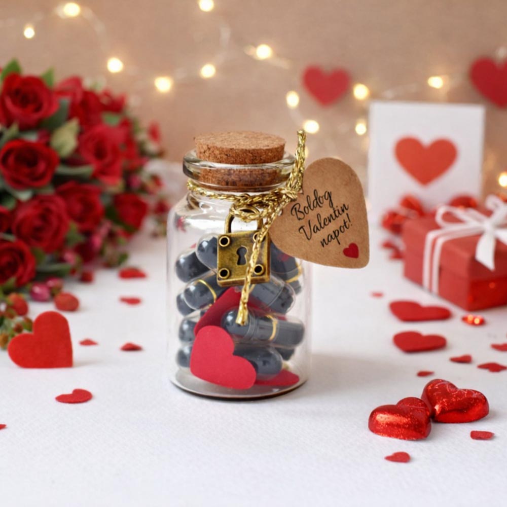 - Piros szívecske az üveg külsején: A szív alakú medálon a „Boldog Valentin napot!” felirat található, tökéletes romantikus hangulatot teremtve.