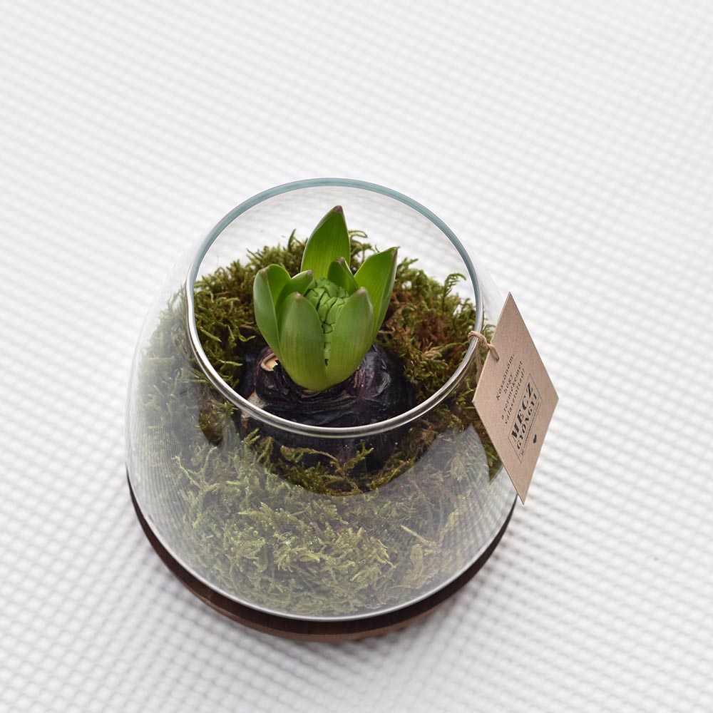 Friss illatú, természetes tavaszi élő virág, jácinttal, üvegtálban fa talpon.