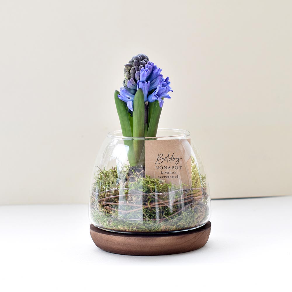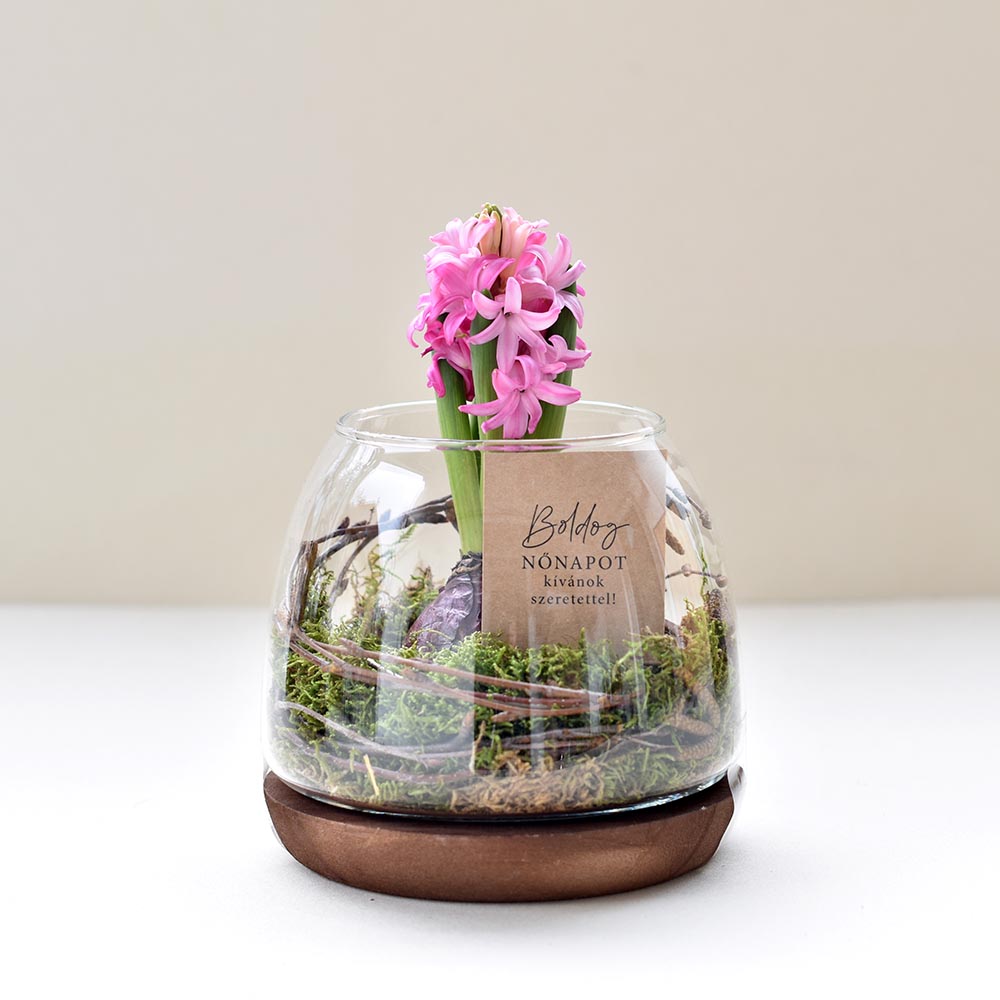 Ez az élő jácint üvegtálban egy időtálló, elegáns és természetes nőnapi ajándék, amely egyszerre dekoráció és élő élmény – a tavasz egyik legszebb hírnöke.