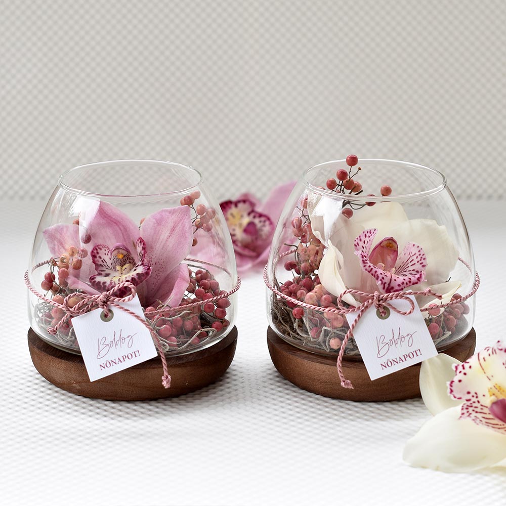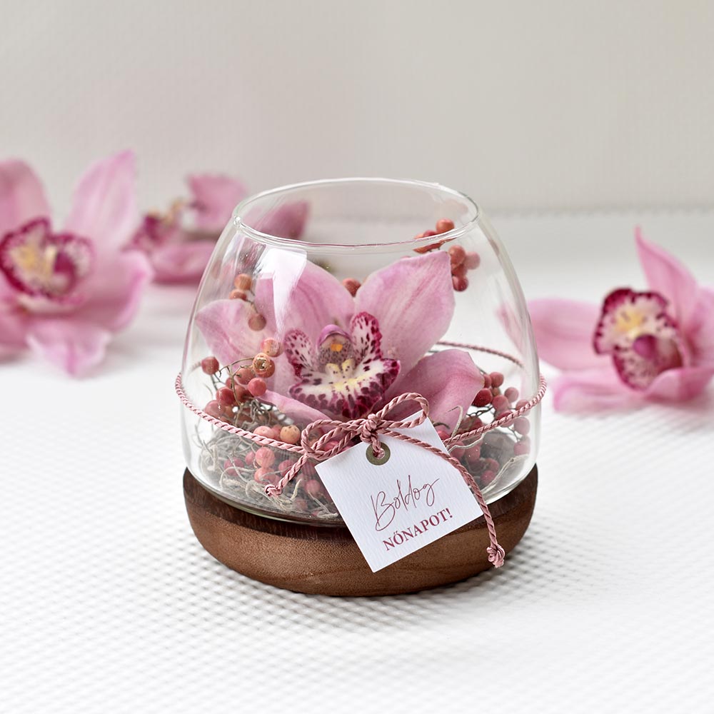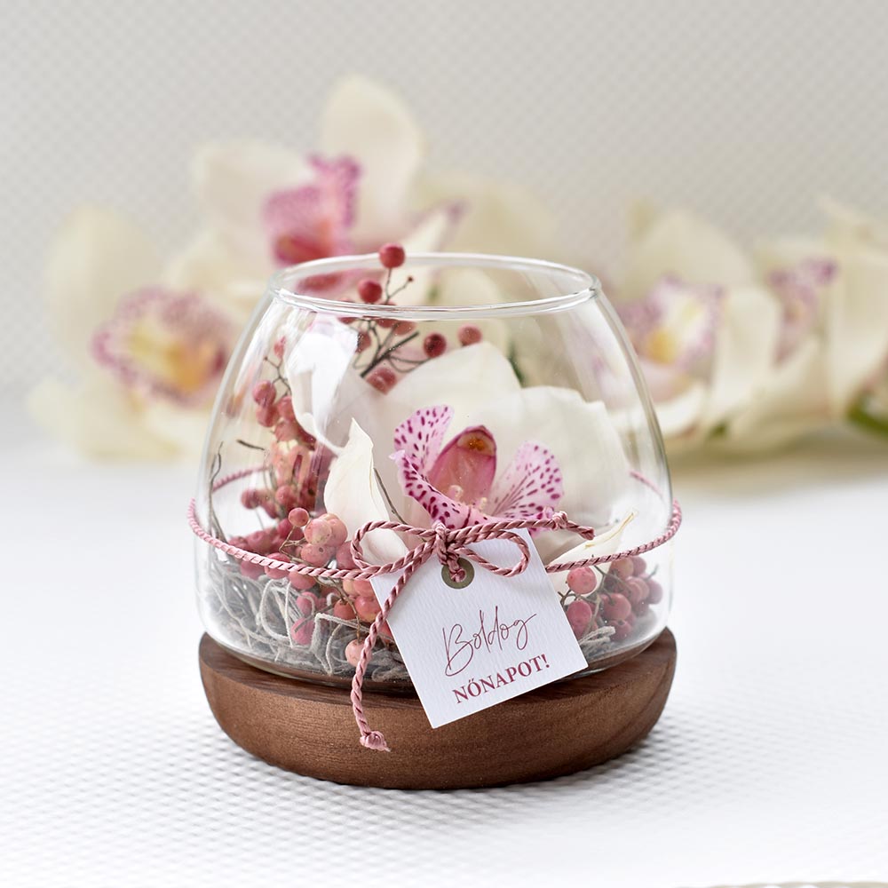 Élő virág nőnapra – orchidea üvegtálban fa talpon