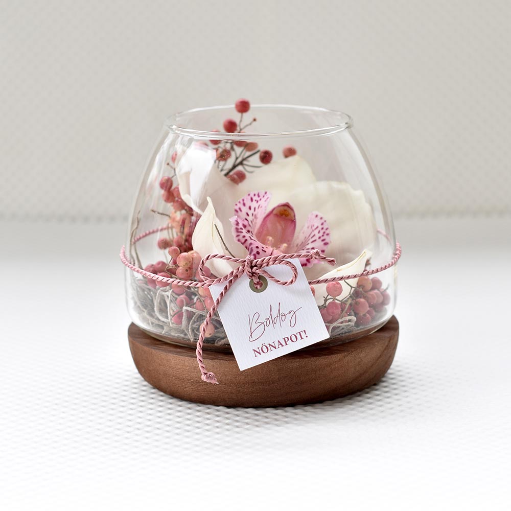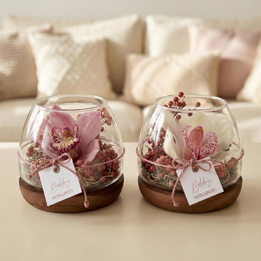 Tartós élő virág nőnapra, orchideával és rózsabors díszítéssel, elegáns üvegtálban.