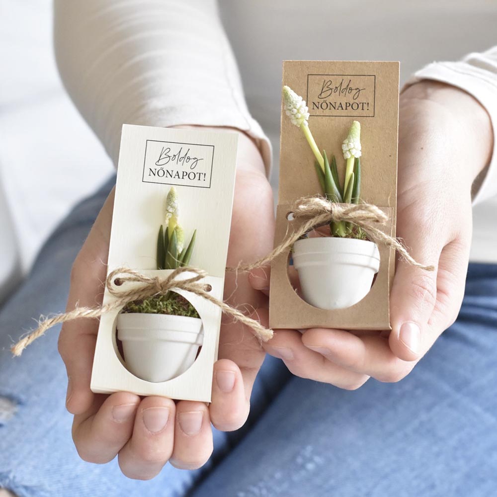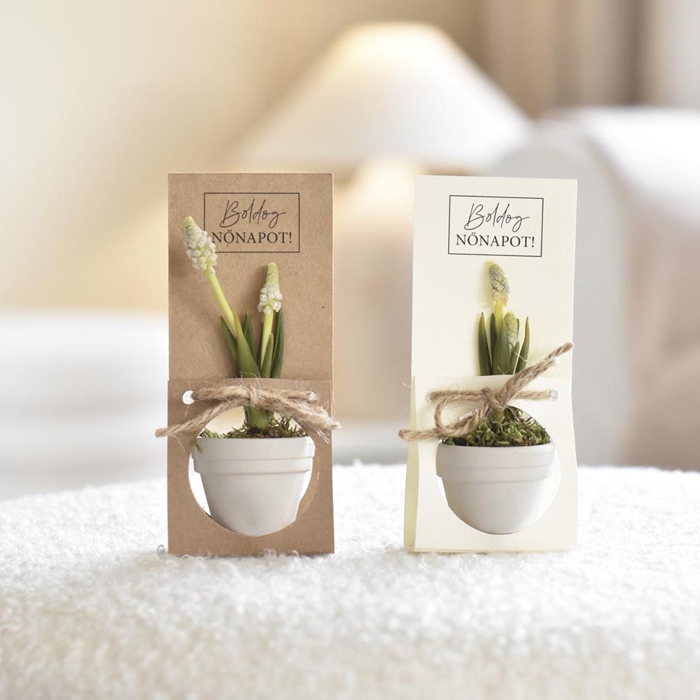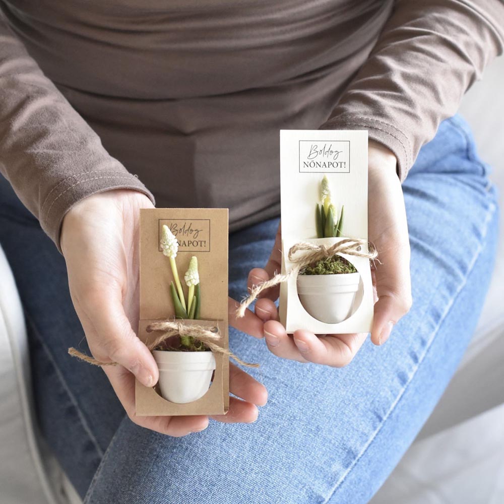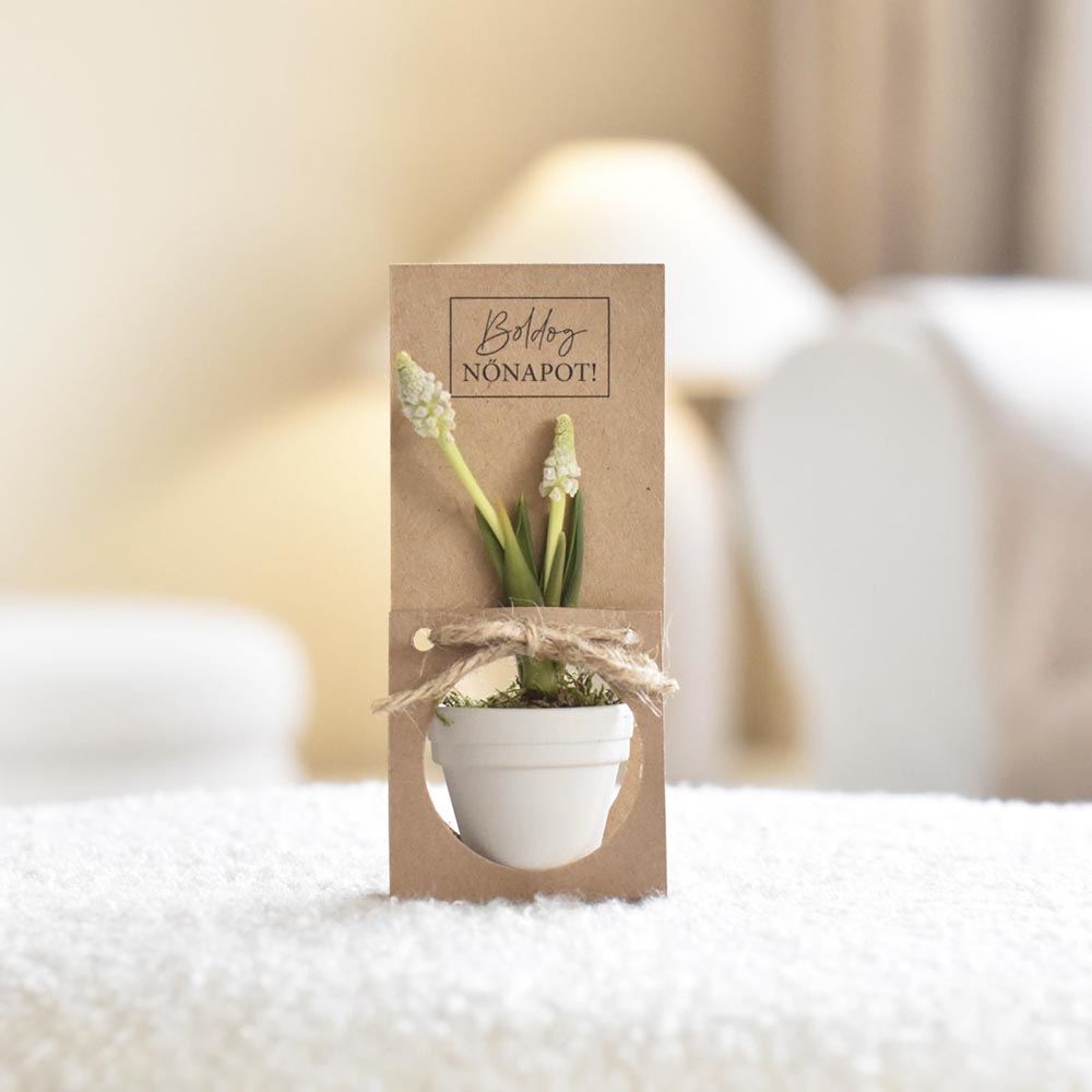 Ez az élő virág nőnapra egy mini kaspóba ültetett, bimbós fürtös gyöngyike, amely egy dekoratív kártyában kapott helyet, masnival rögzítve. Friss, természetes és igazán különleges nőnapi ajándék, amely hosszabb ideig örömet szerez.