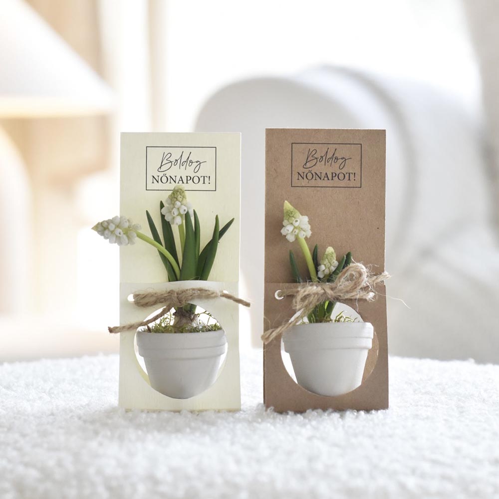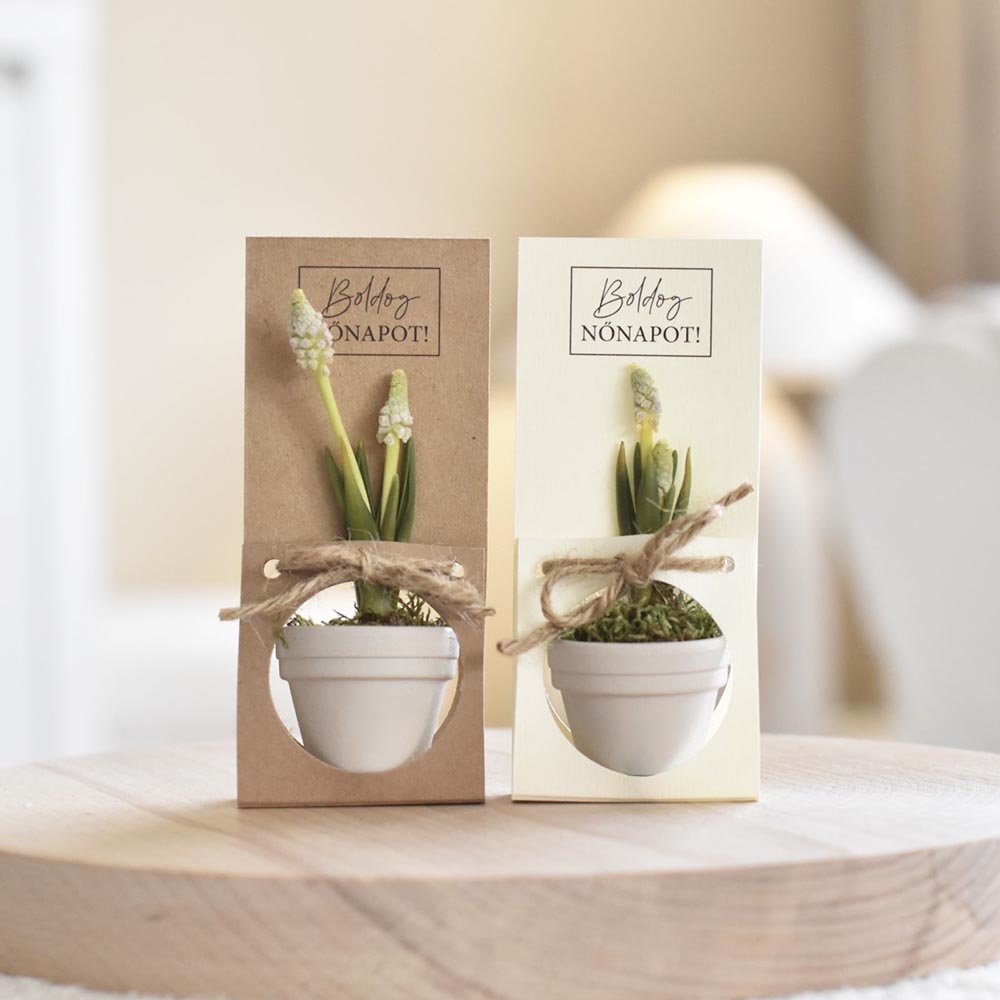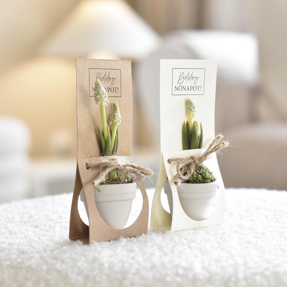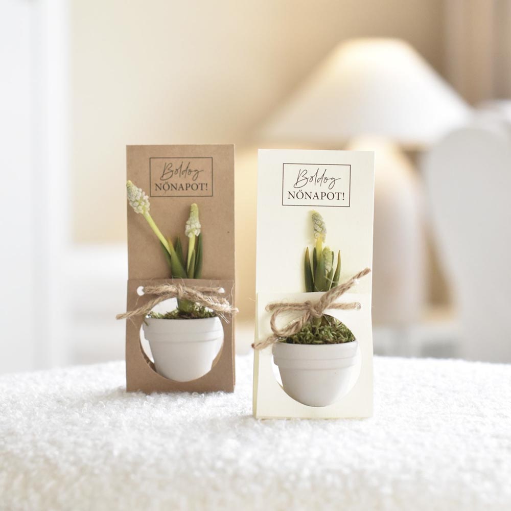 Ez az élő virág nőnapra egy mini kaspóba ültetett, bimbós fürtös gyöngyike, amely egy dekoratív kártyában kapott helyet, masnival rögzítve. Friss, természetes és igazán különleges nőnapi ajándék, amely hosszabb ideig örömet szerez.