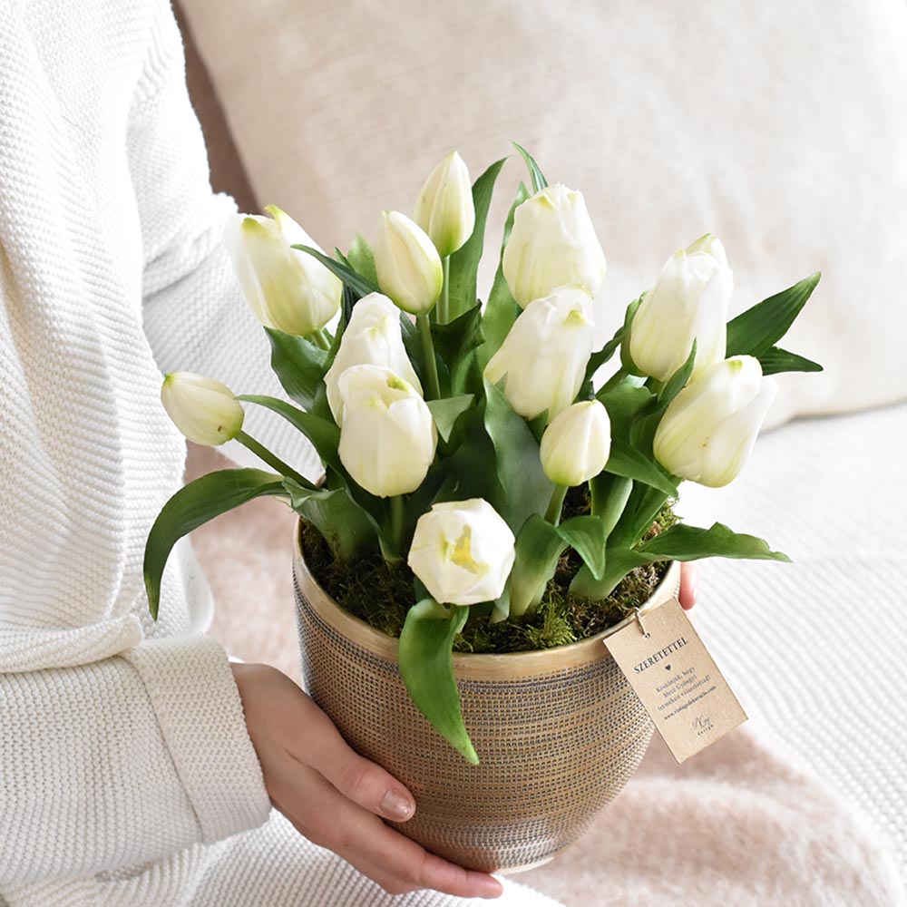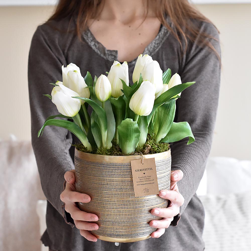 Dobd fel otthonod tavaszi hangulatát ezzel az elegáns kaspóba rendezett fehér tulipánkompozícióval! A gondosan összeállított, élethű művirágok hosszú távon megőrzik frissességüket, így tökéletes dekoráció nappaliba, hálószobába vagy akár az előszobába. A modern arany kaspó különleges textúrája kifinomult megjelenést kölcsönöz ennek a stílusos lakásdekorációnak.