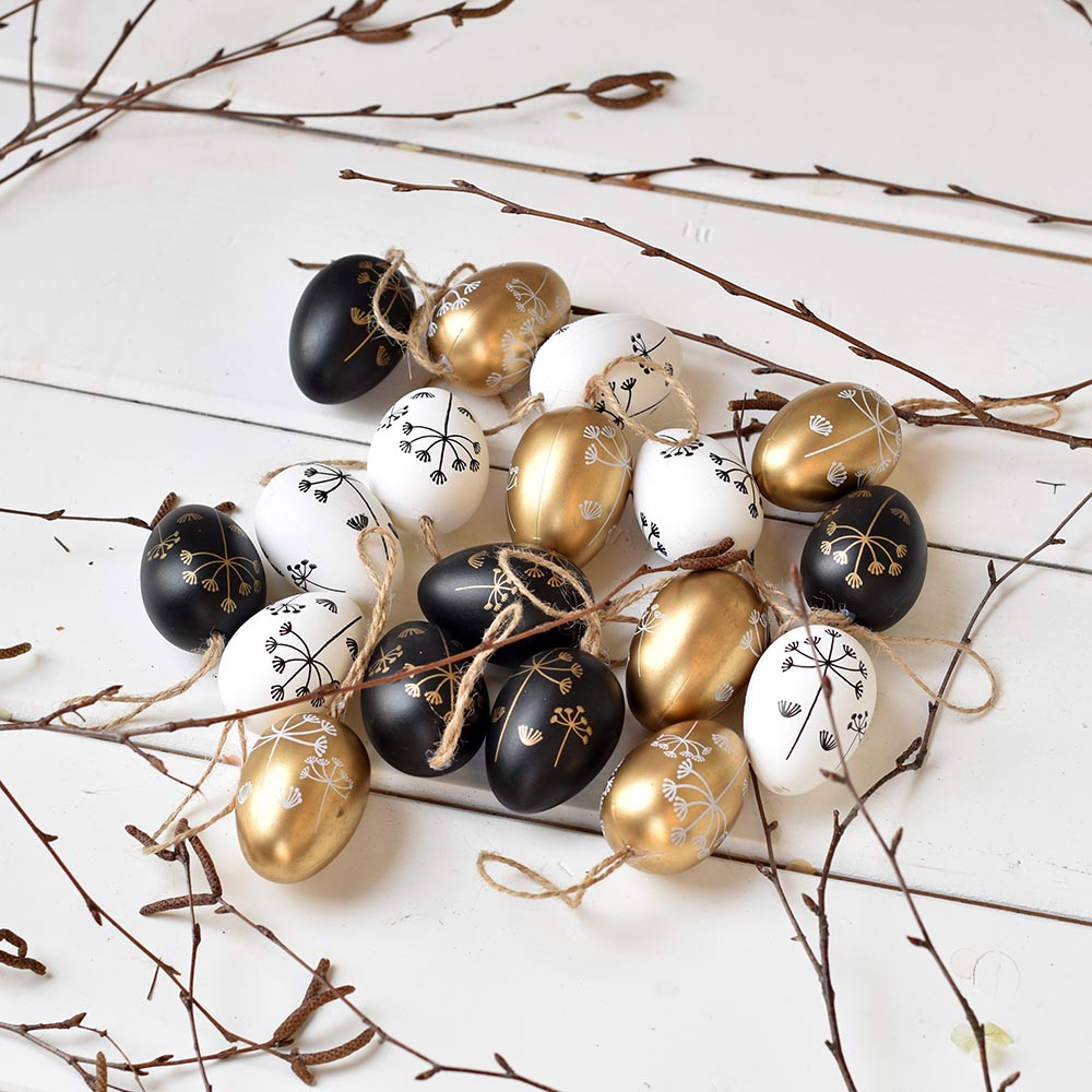 Elegáns fekete–fehér–arany színvilágú, akasztható húsvéti tojás szett 18 darabos kiszerelésben, modern tavaszi dekorációhoz.