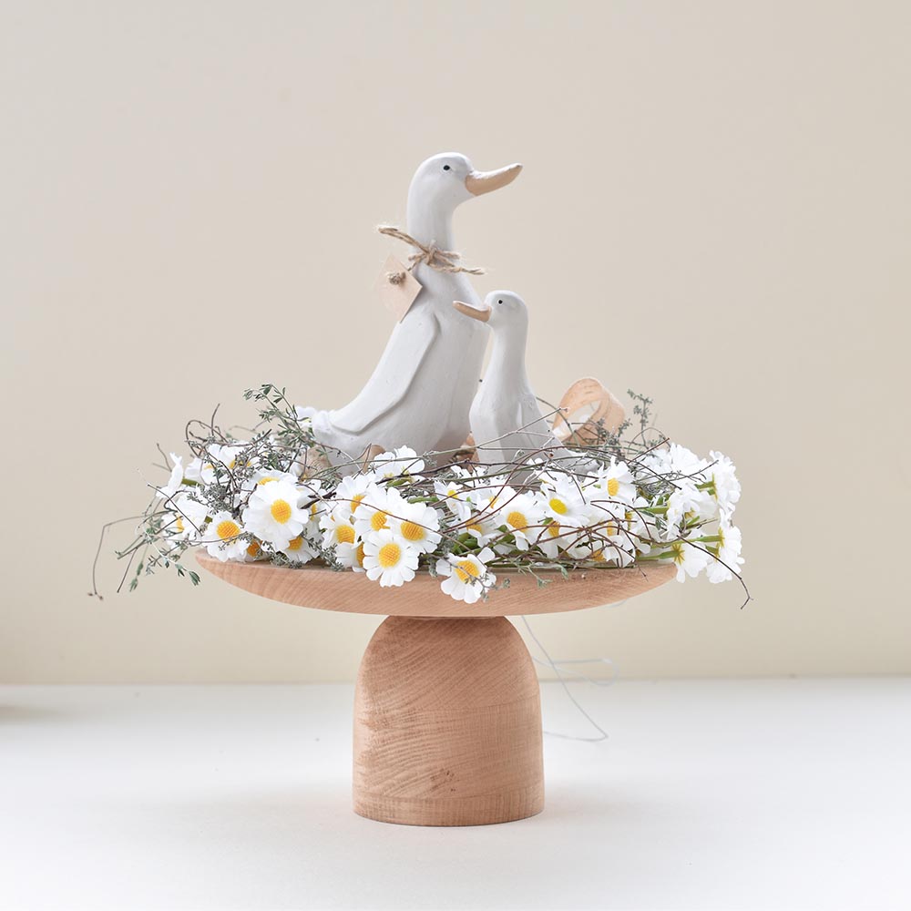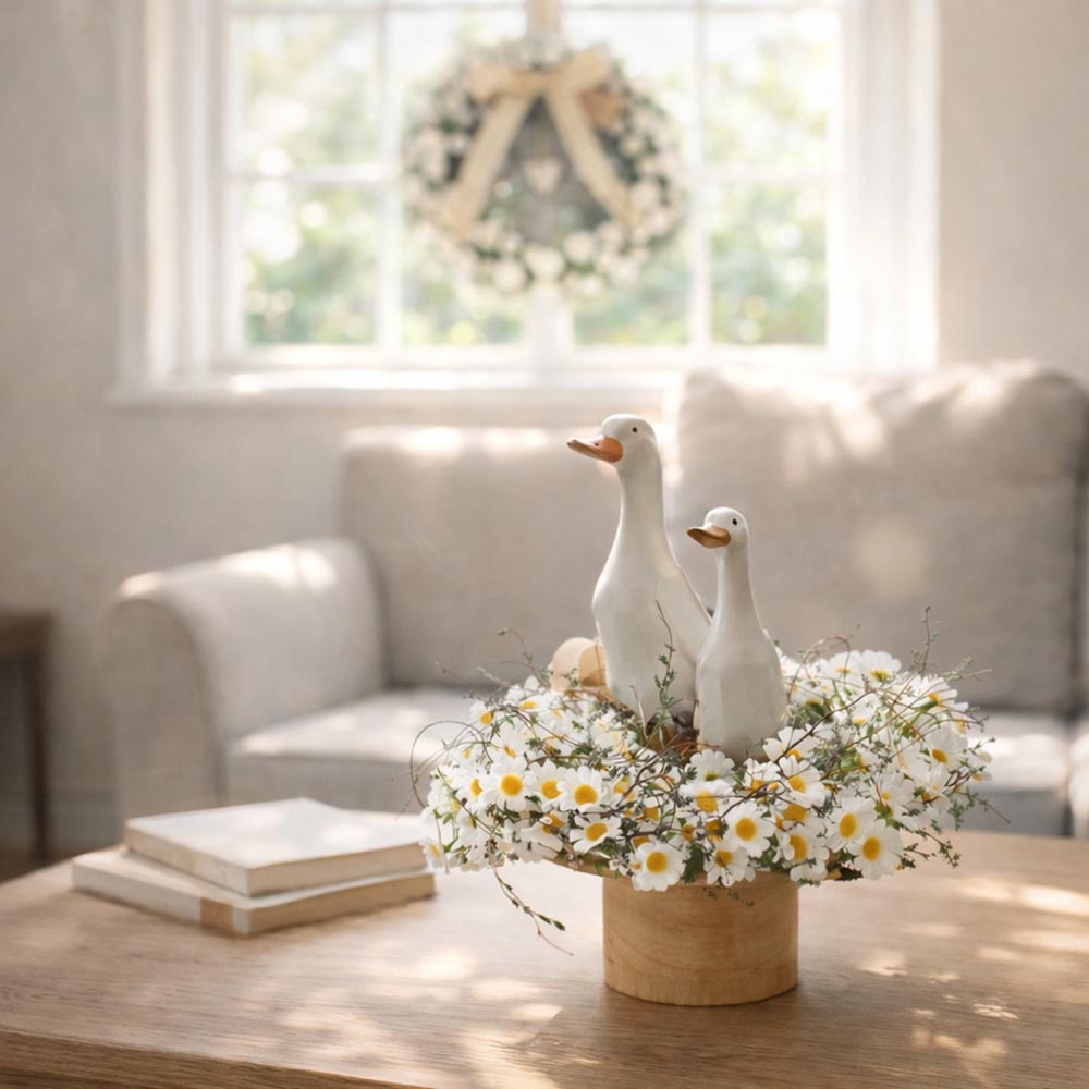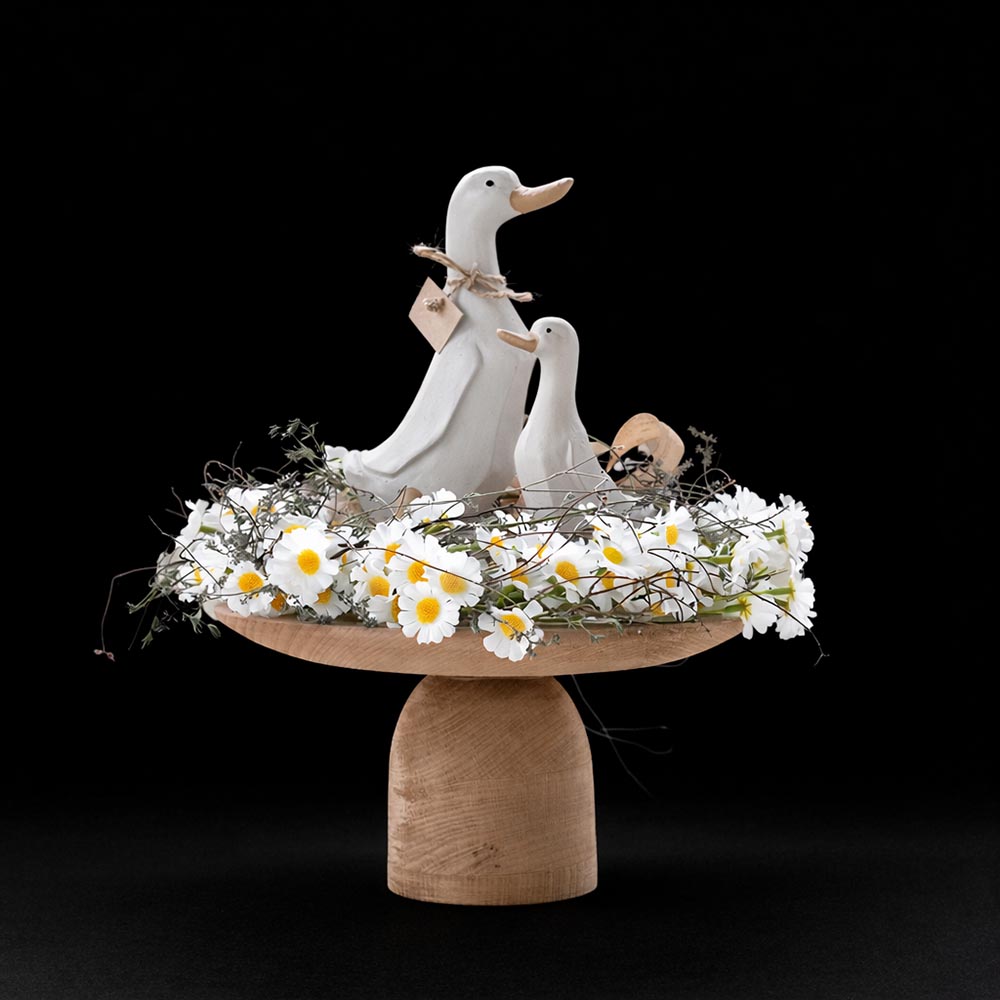 Ez a húsvéti asztaldísz élethű kamilla virágokkal és libákkal friss, természetes hangulatot visz az otthonodba. A kompozíció középpontjában két kedves liba figura áll, melyeket kamilla virágok és finom ágacskák vesznek körbe egy fa talpas tálon.