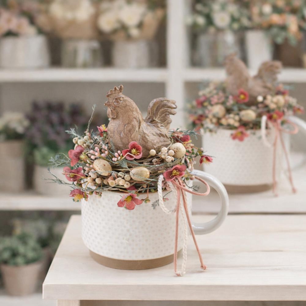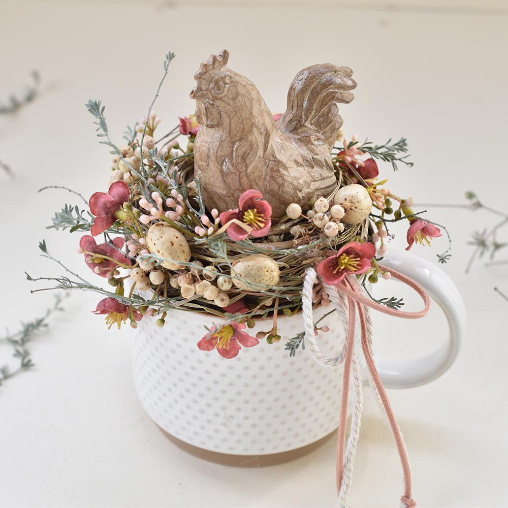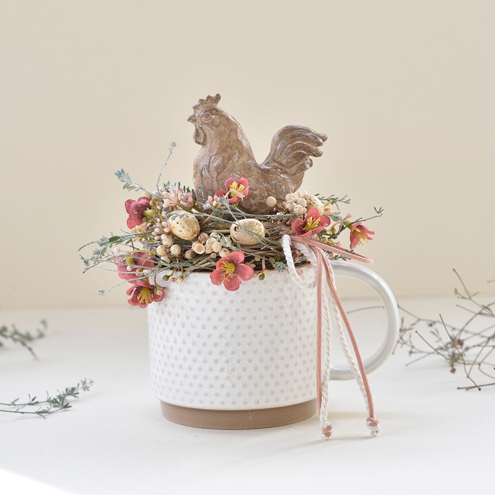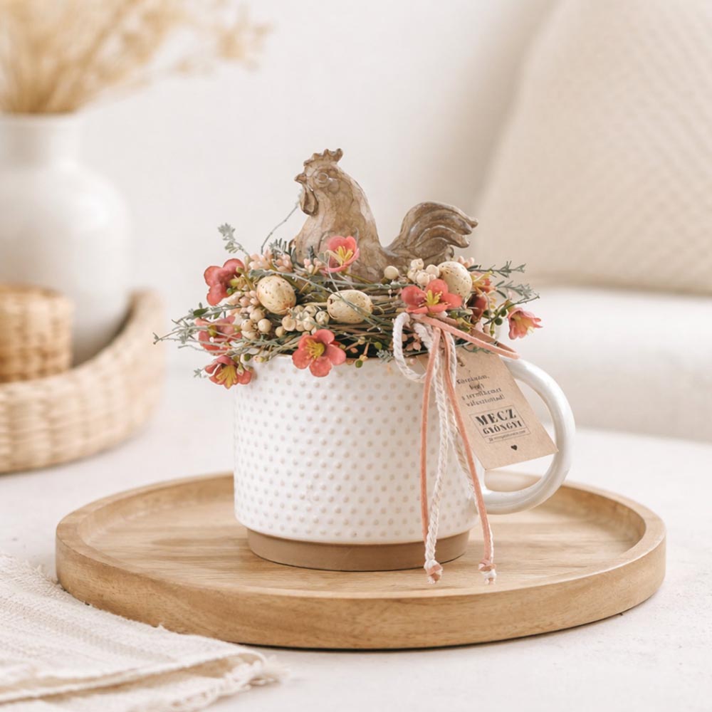 Kakasos húsvéti asztaldísz bögrében, finom wax virágokkal körülölelve.