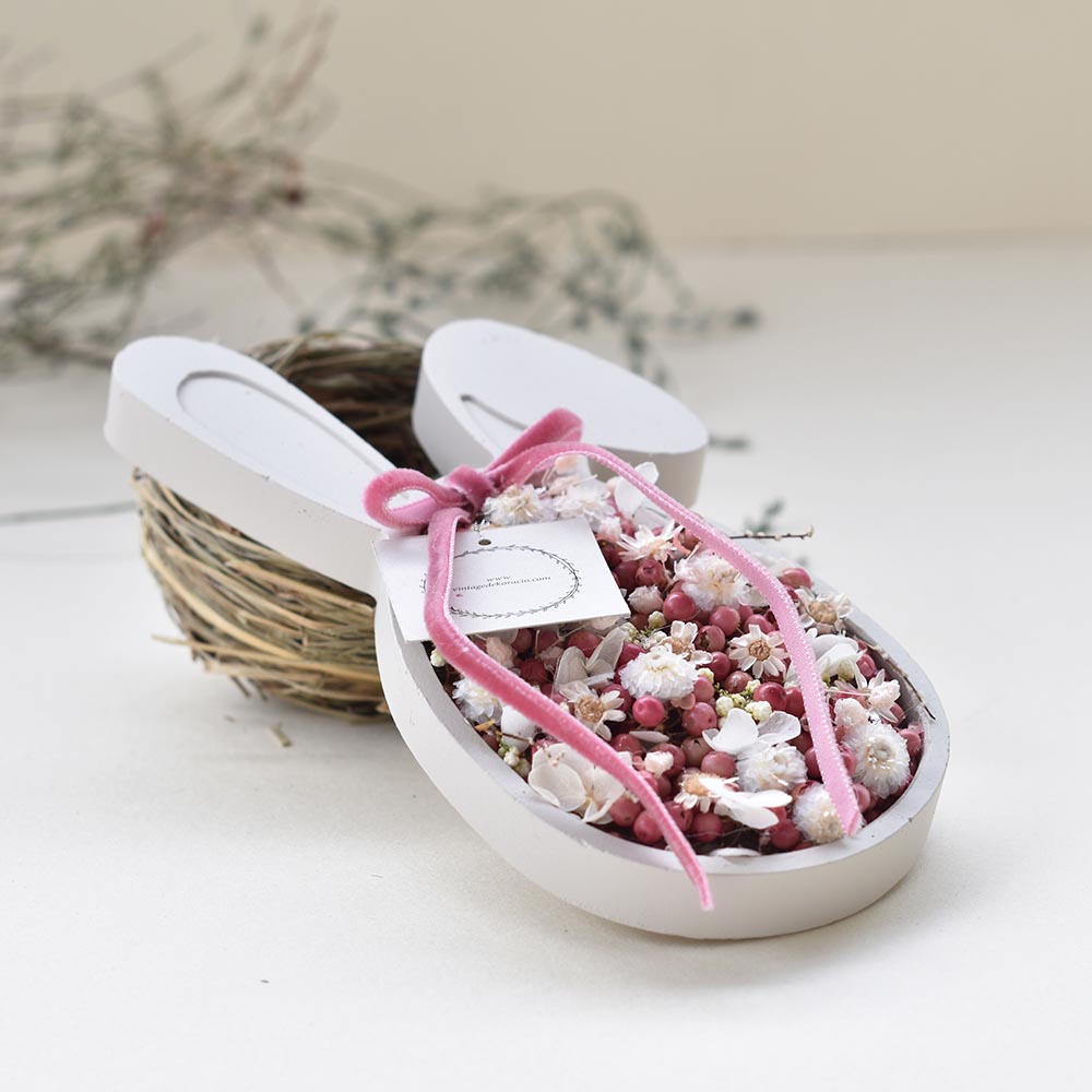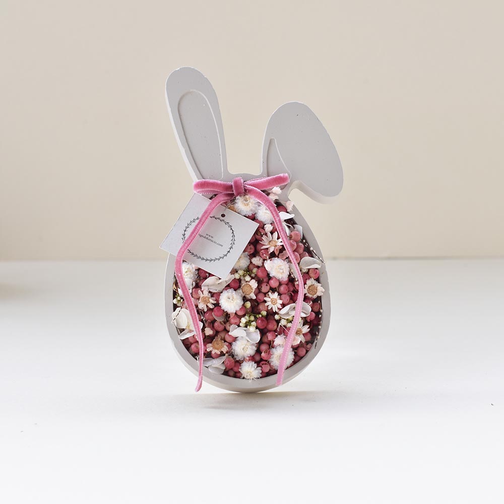 Ez a kedves húsvéti nyuszi dekoráció nyuszi fej formájú alapra készült, melyet rózsabors szemek és finom, fehér szárazvirágok töltenek meg. A pasztell színvilág és a természetes elemek harmonikus, tavaszi összhatást adnak a dísznek.