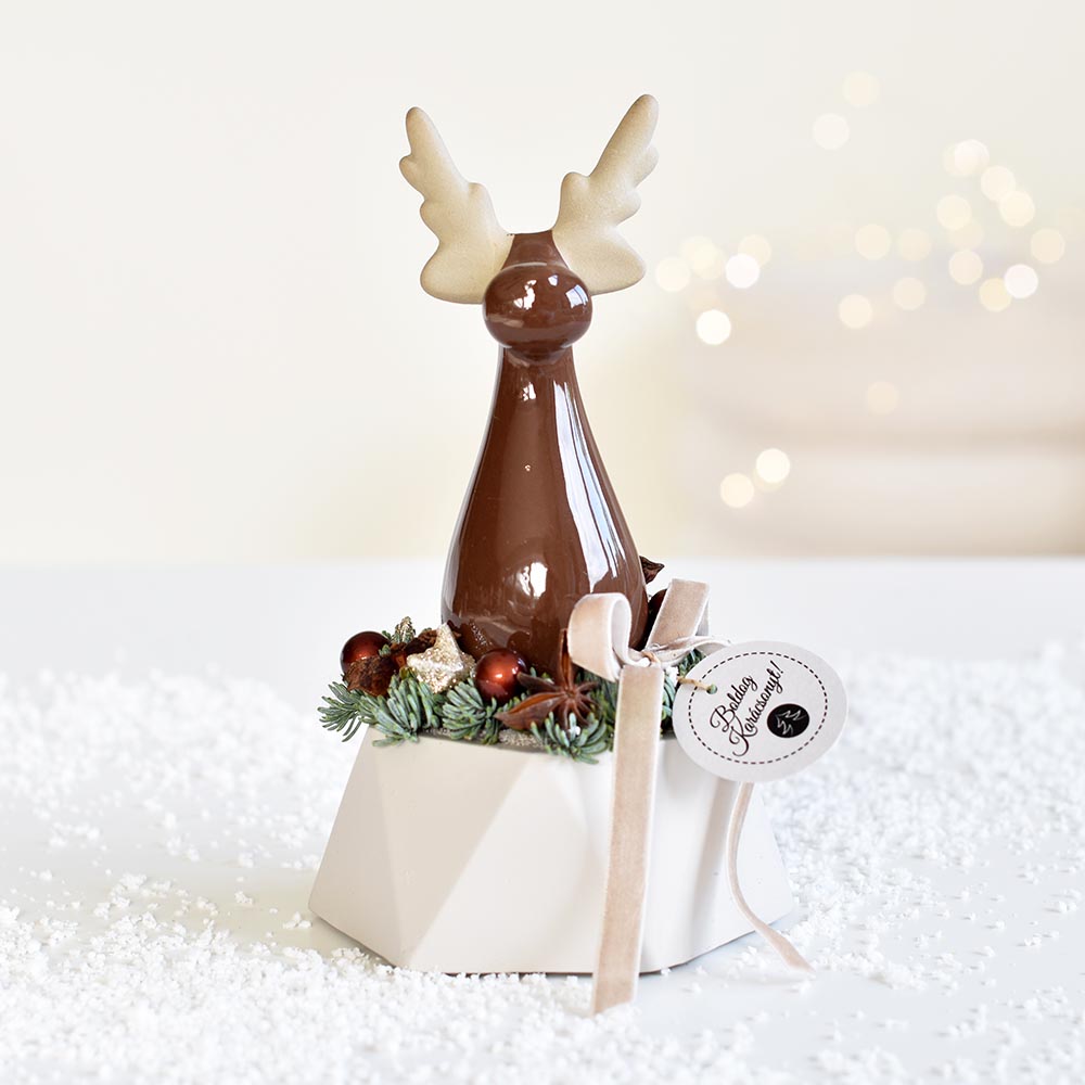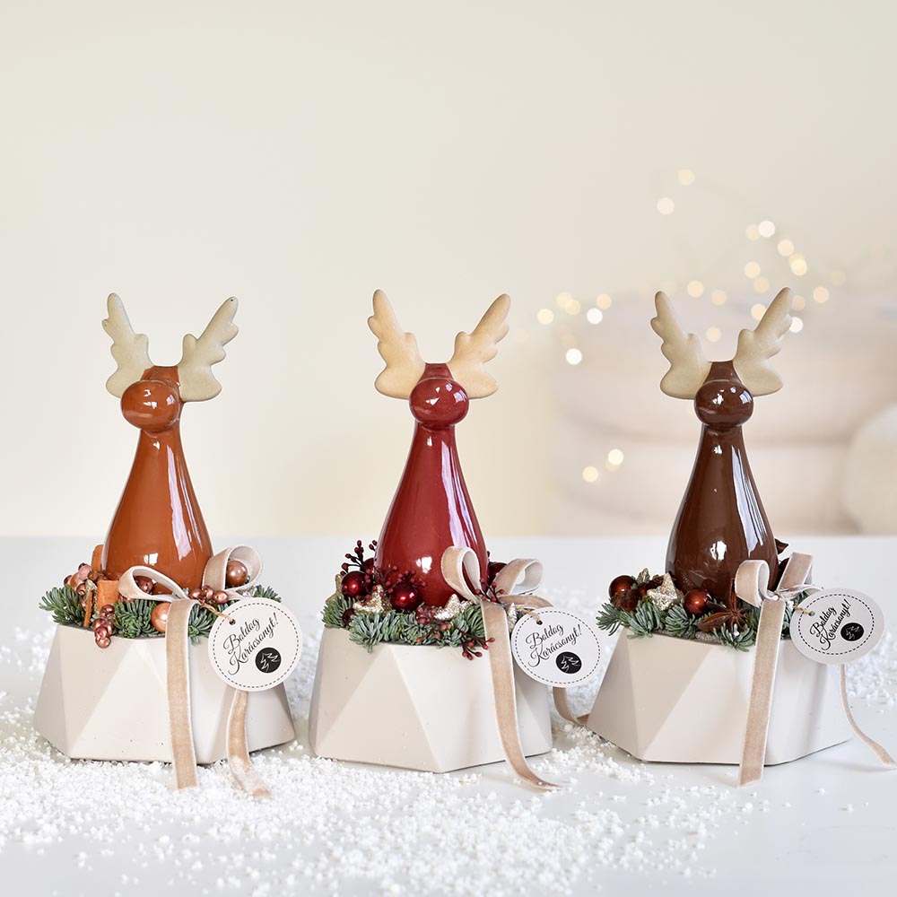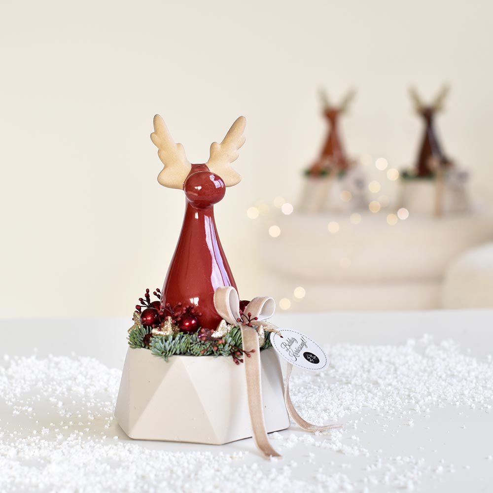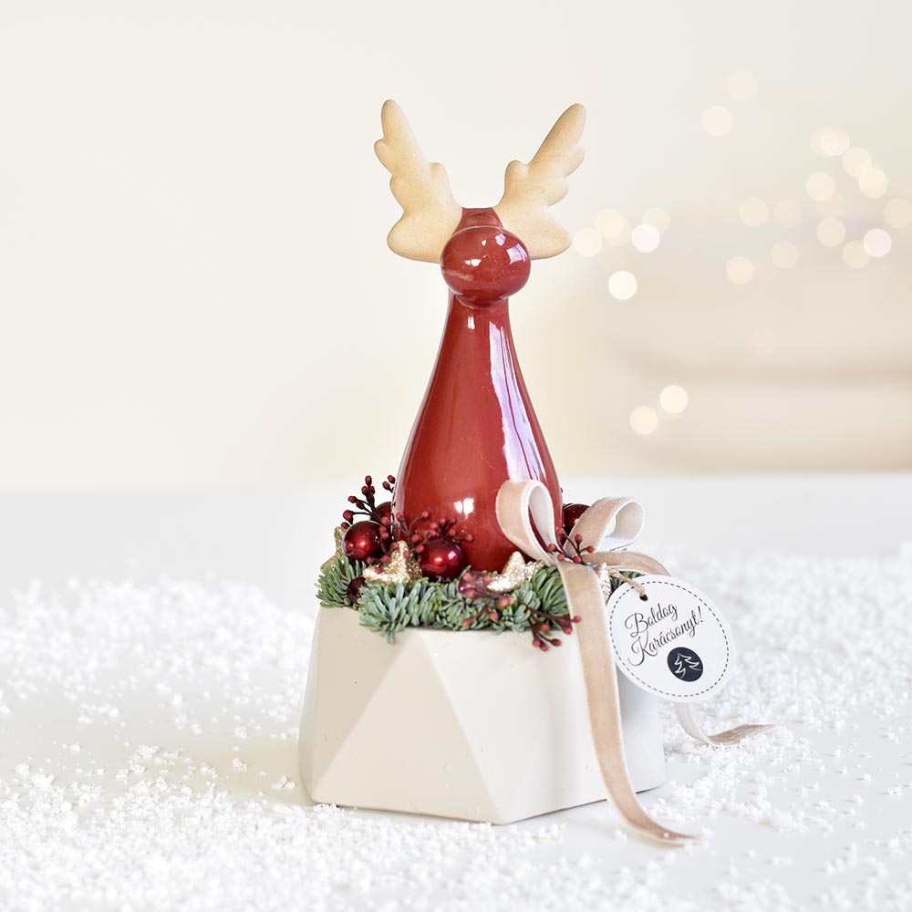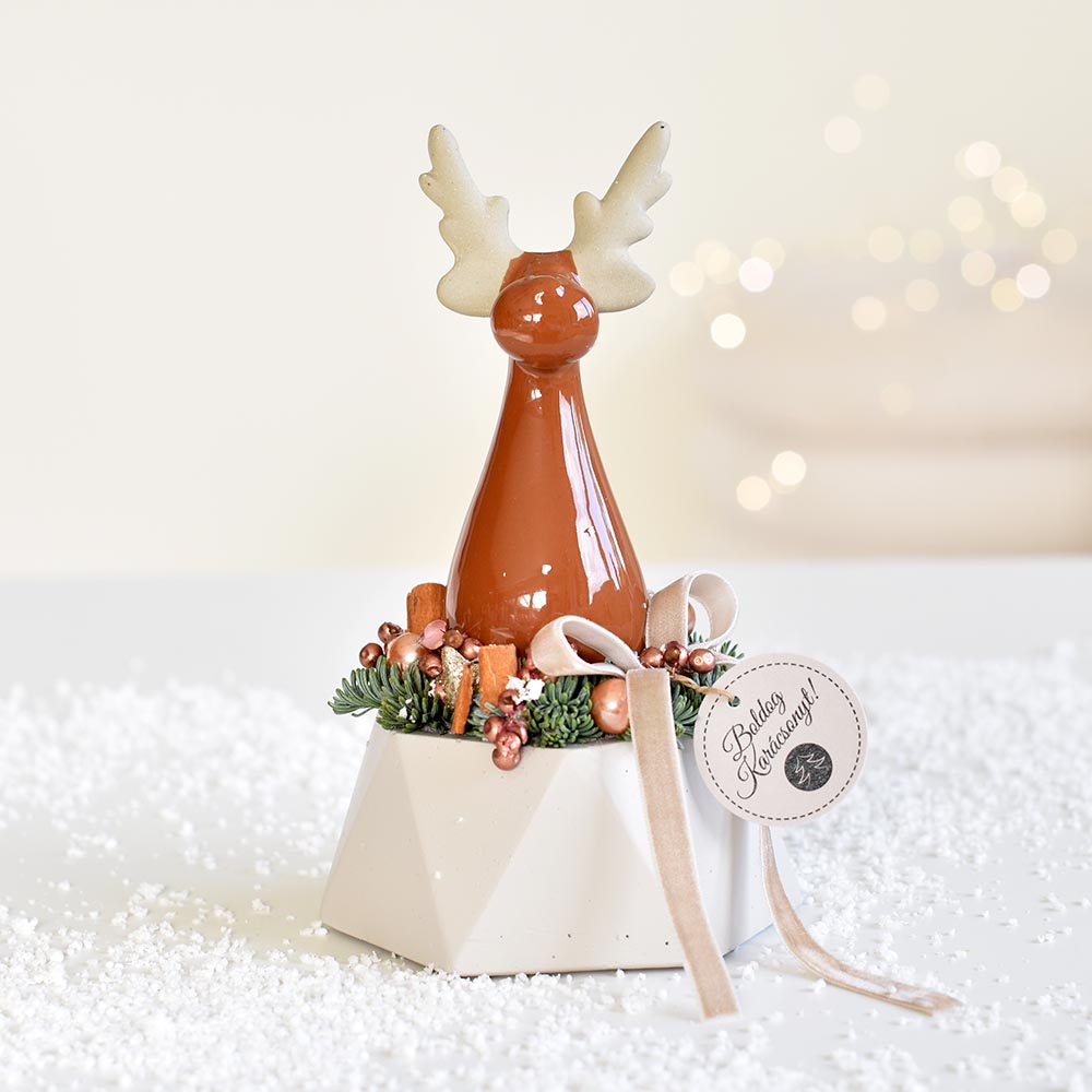 A dekoráció középpontjában egy letisztult formavilágú, fényes kerámia rénszarvas áll, körülötte apró ünnepi díszekkel, fenyőágakkal és masnival kiegészítve.