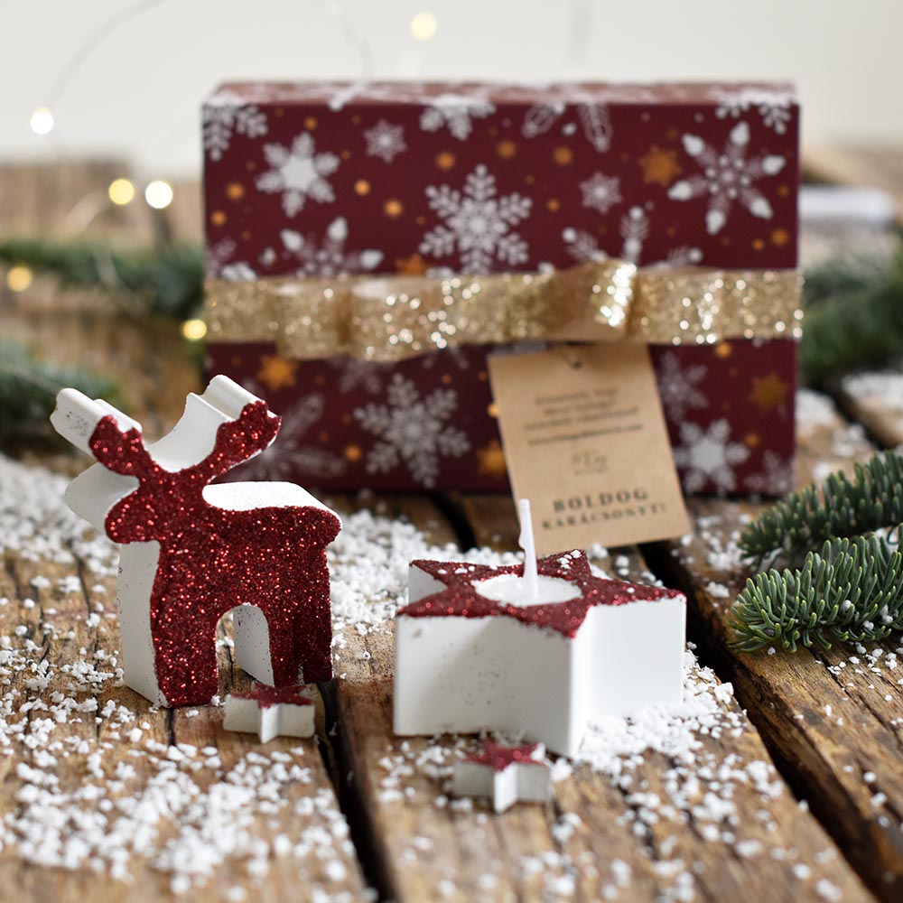 A díszdoboz mérete: 15x10x4 cm, csillag: 6×2,5 cm, szarvas: 6,5x5x2 cm