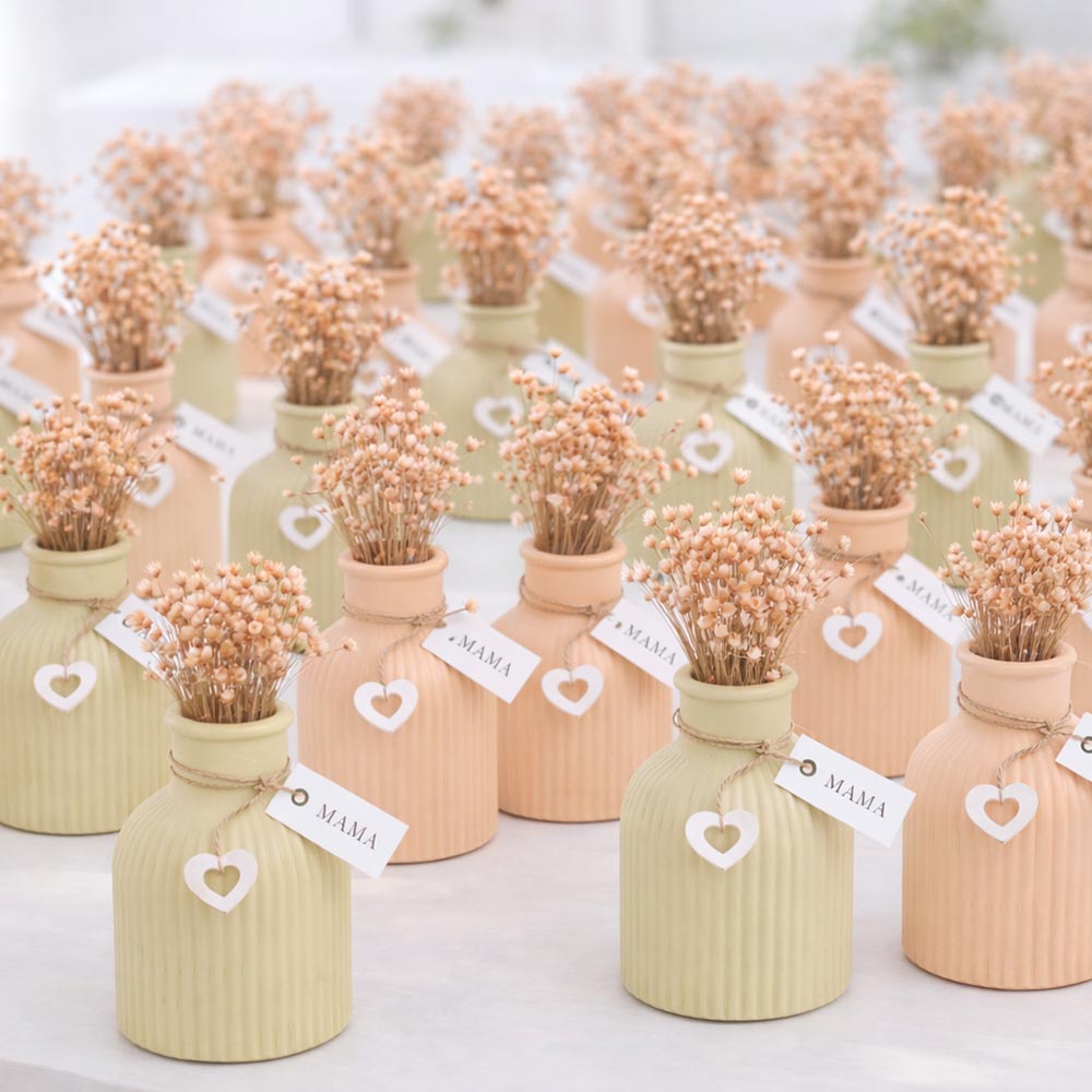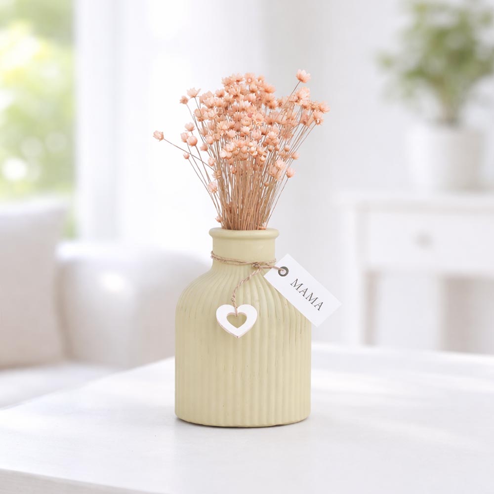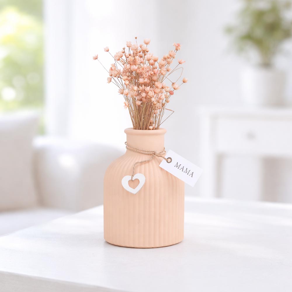 A váza elegánsan bordázott, a benne lévő szárított virág pedig szintén barack színben pompázik.