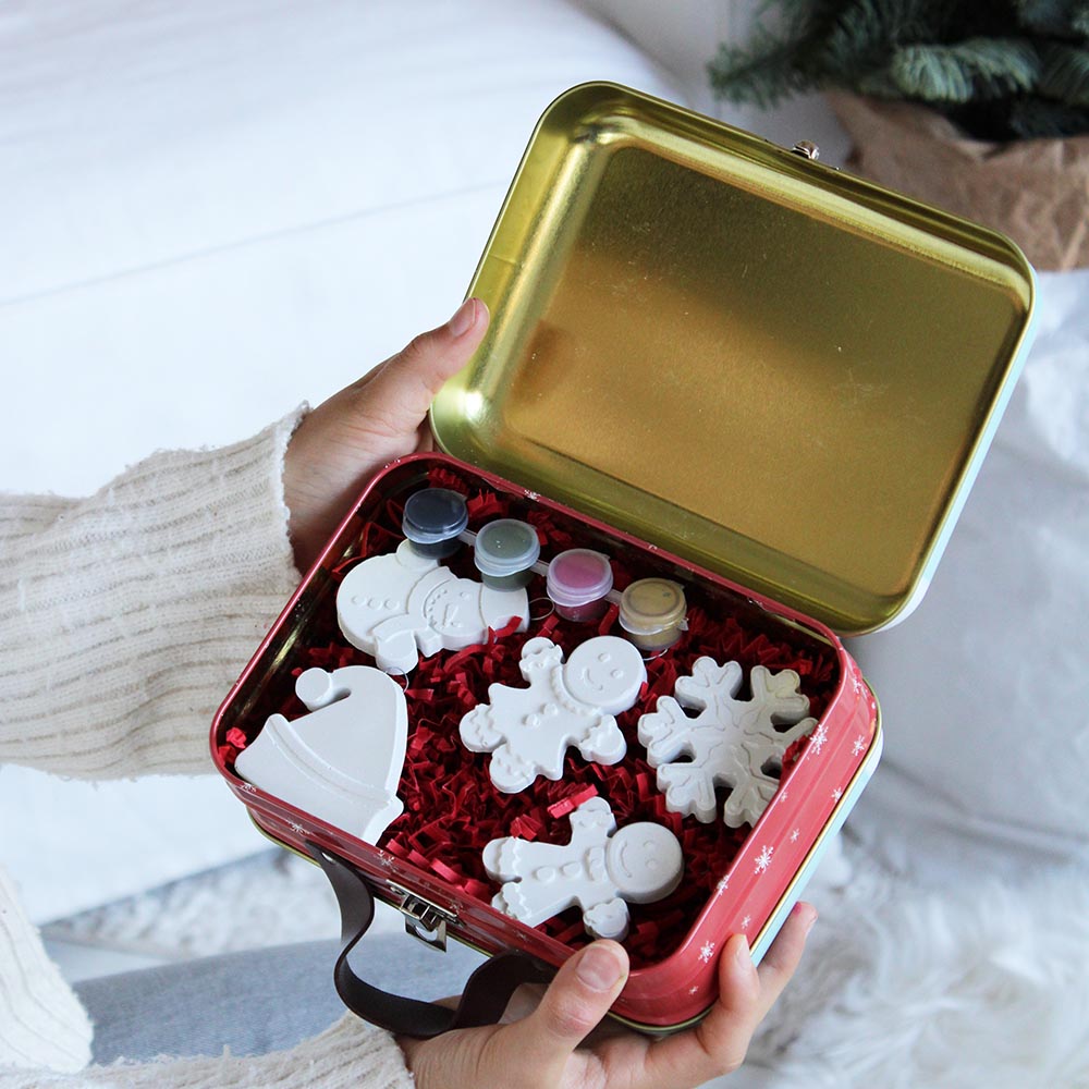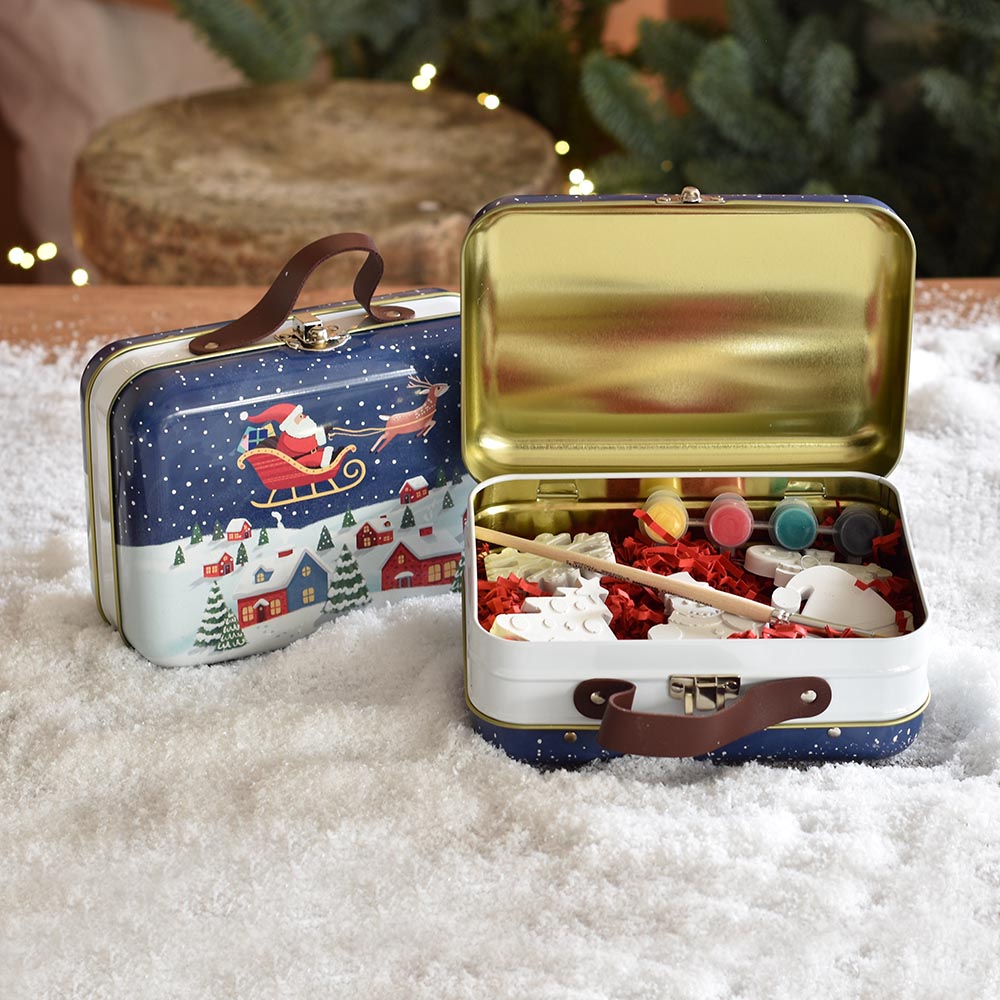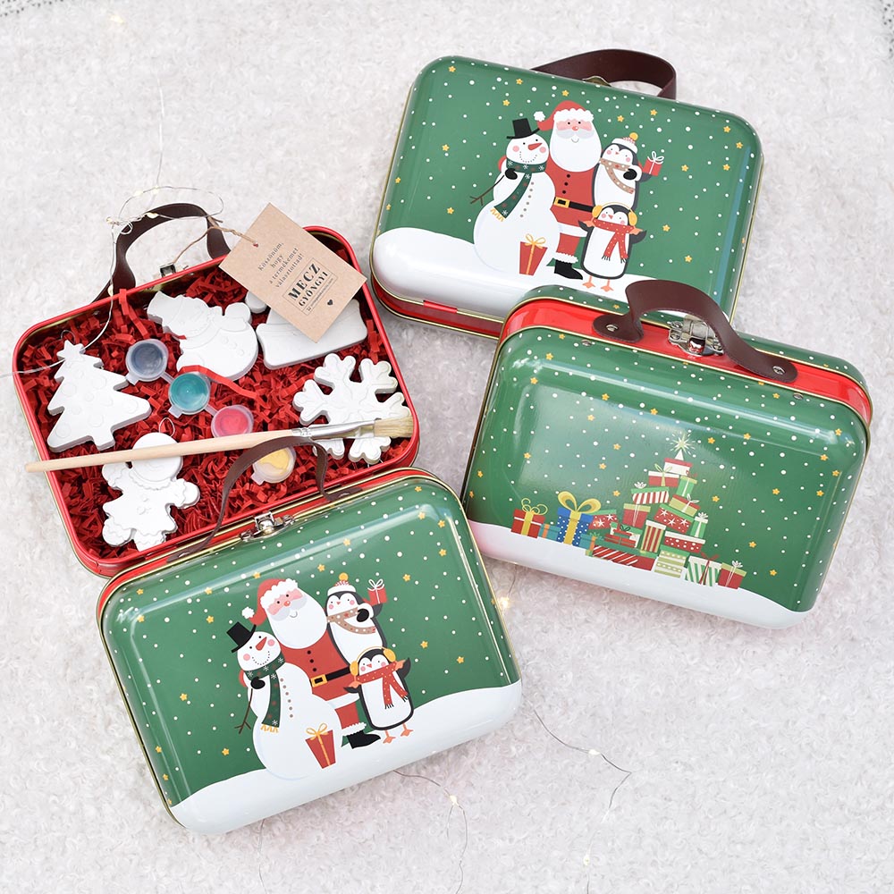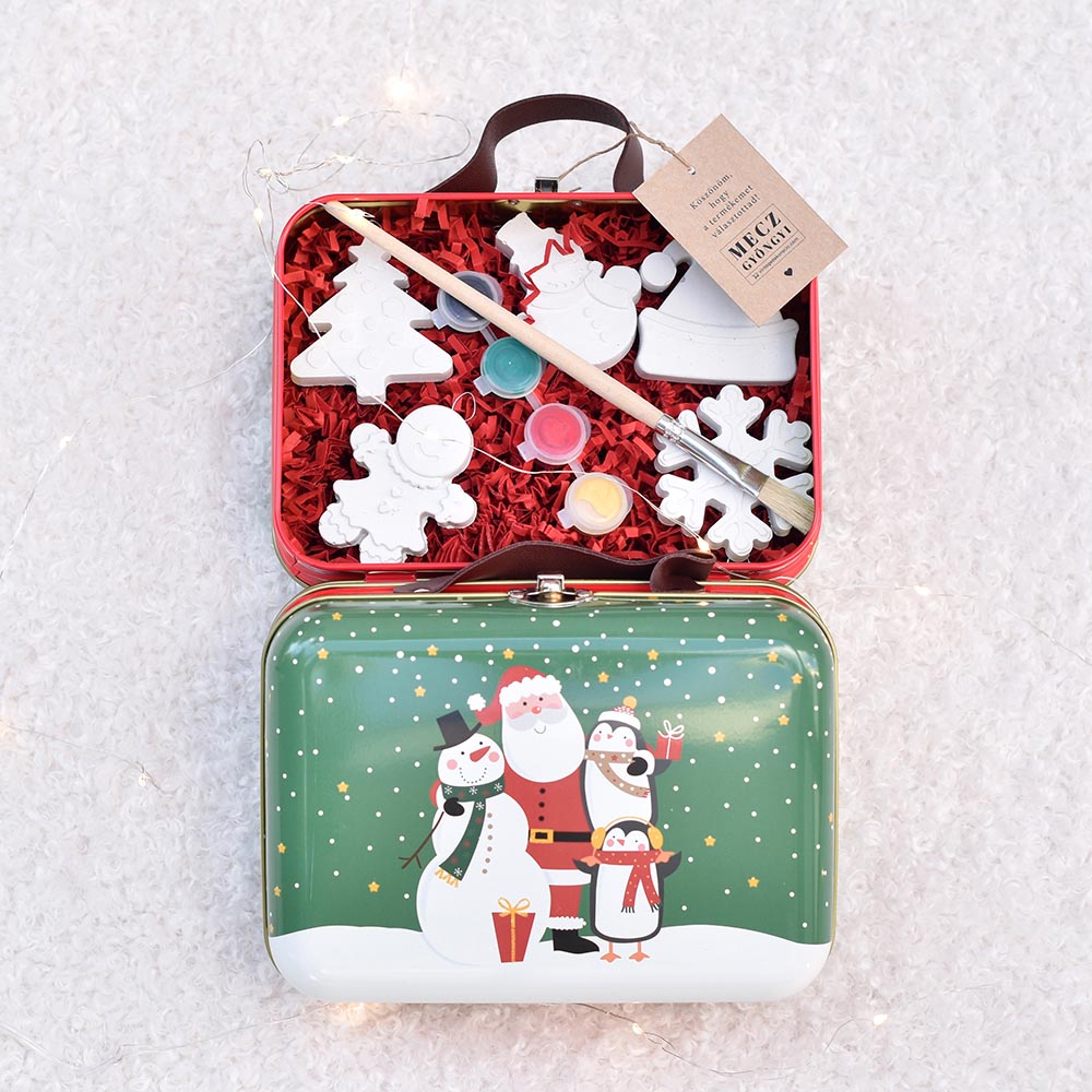 Ez nem egy szokványos mikulás csomag: ez egy ajándékdoboz, ami egy kézműves DIY csomagot is tartalmaz! Négy színben választható a kis bőrönd, különböző karácsonyi grafikákkal. Az akasztóval ellátott, kifesthető figurák akár karácsonyfadíszként is használhatók – vagy ajándékba is adhatók.