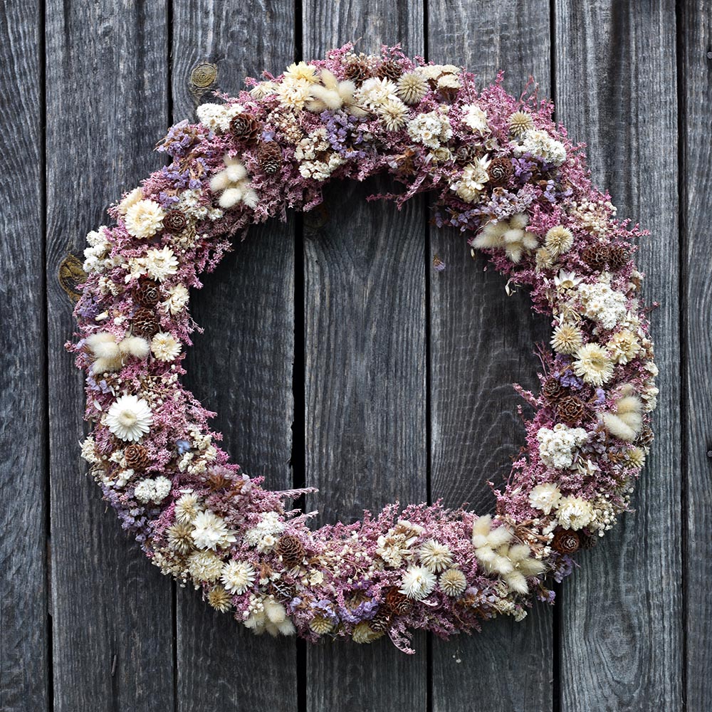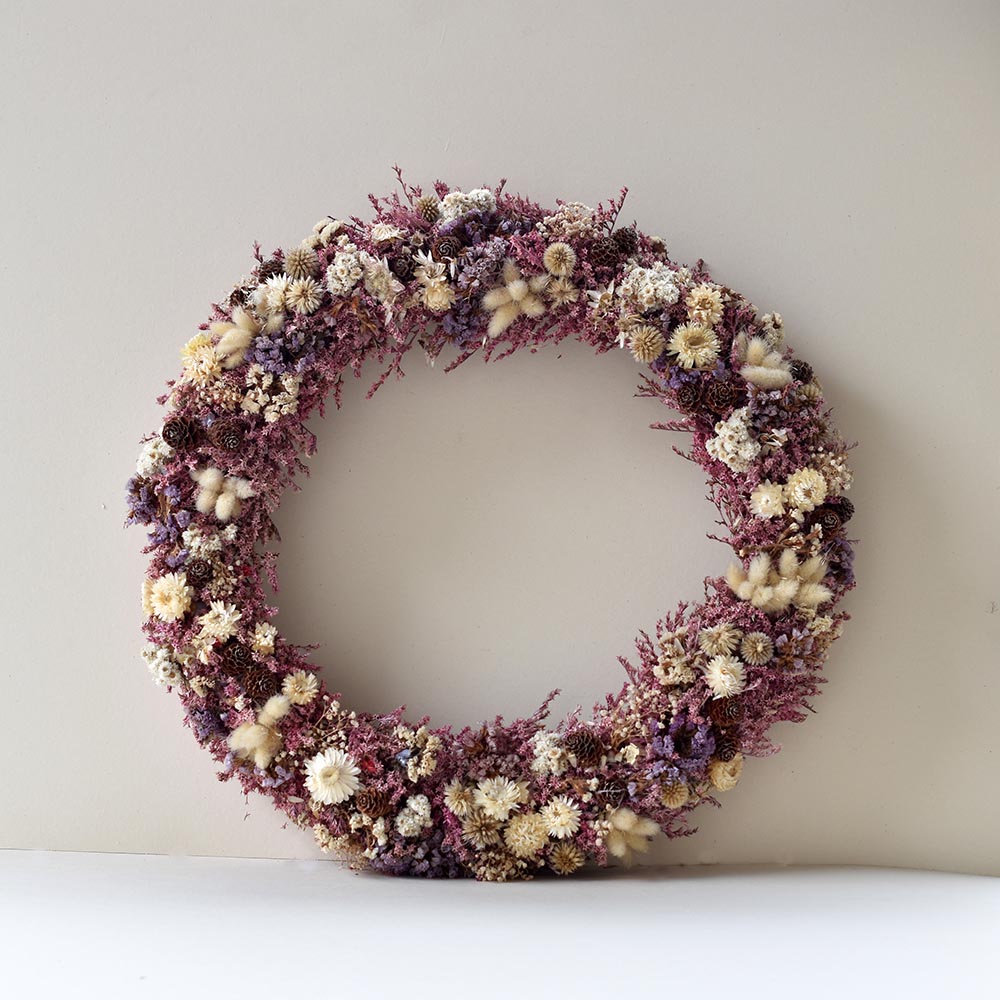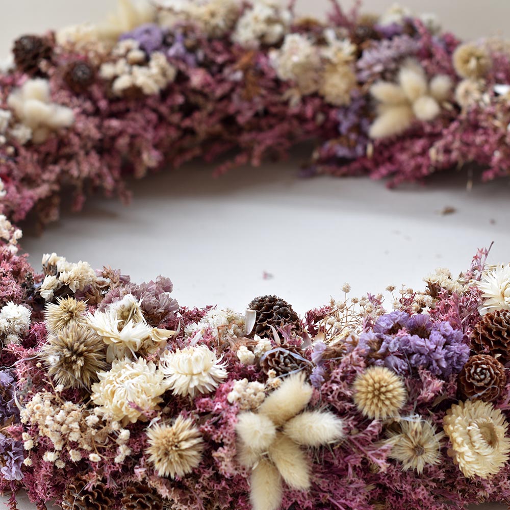 Ez a nagyméretű, kézzel készült szárazvirág koszorú az időtlen szépség és a természetes harmónia találkozása. Gondosan válogatott, tartósított és szárított virágokból áll, amelyek finom árnyalataikkal és gazdag textúráikkal különleges, mégis nyugodt hangulatot teremtenek.