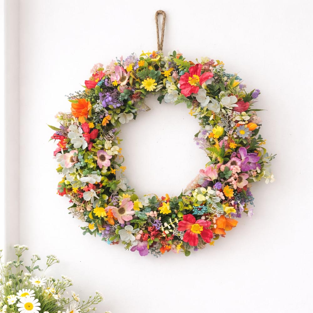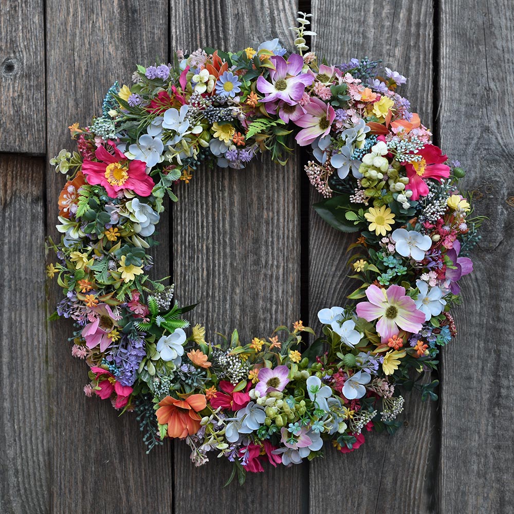 A tavaszi ajtókoszorú méretének köszönhetően önmagában is erős fókuszpont, nem igényel további kiegészítőket. Különösen jól mutat fa-, világos vagy natúr ajtókon, de fedett teraszon vagy bejárati falon is gyönyörű.