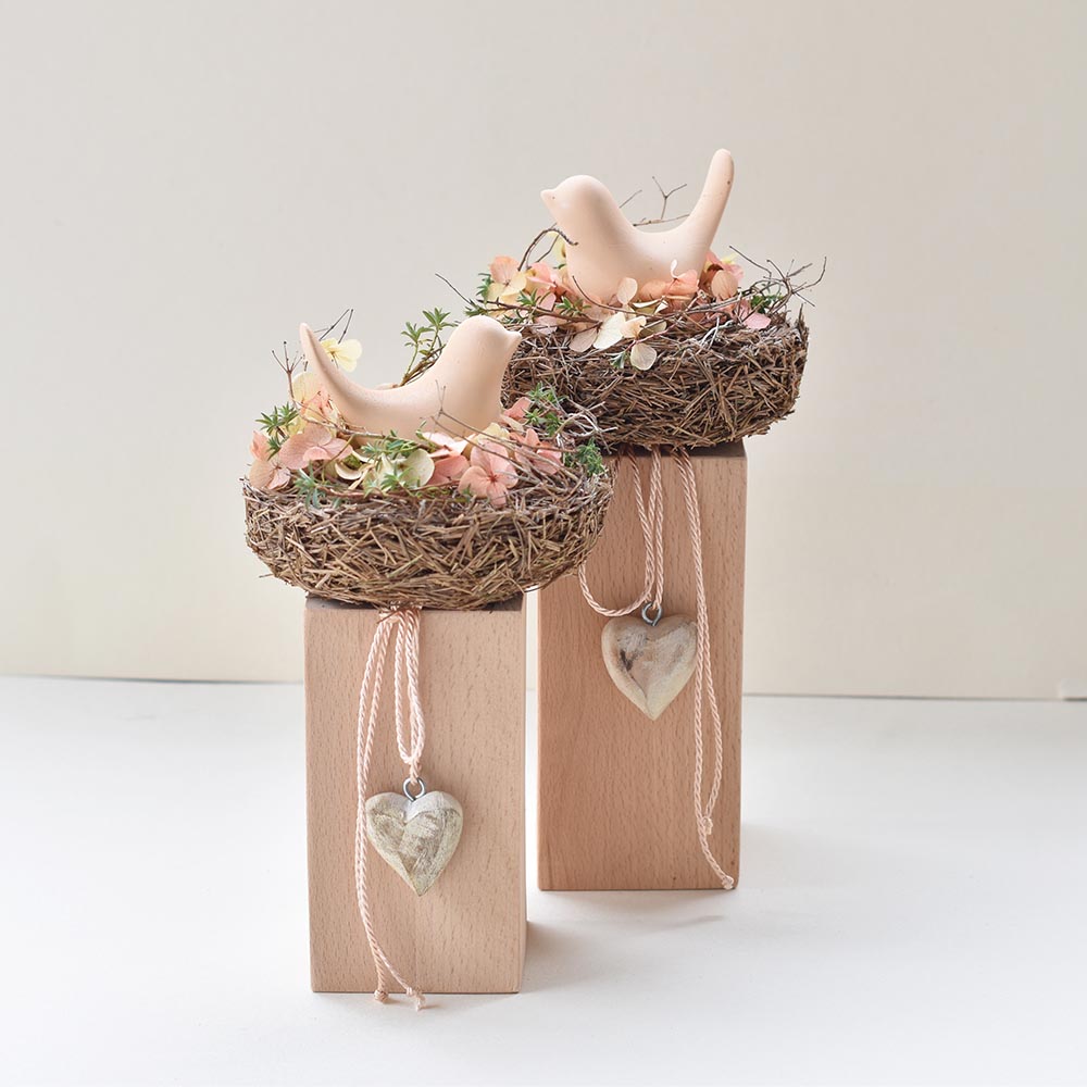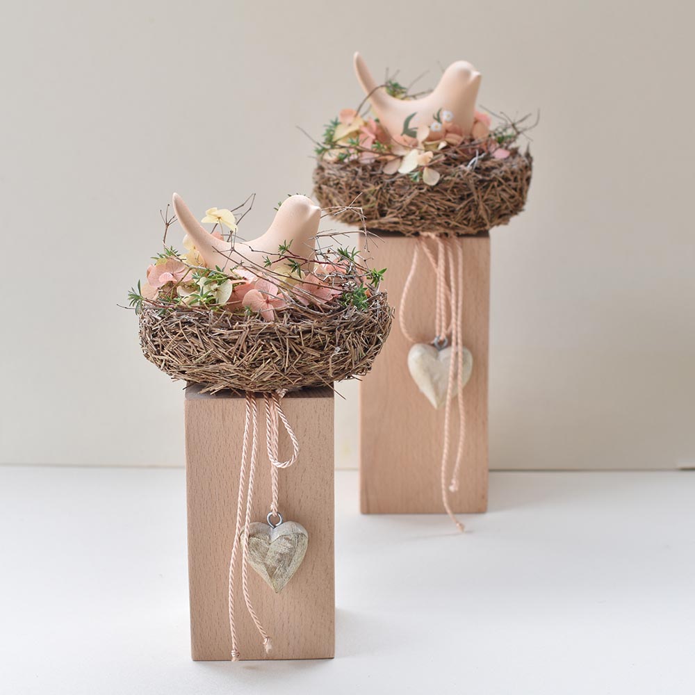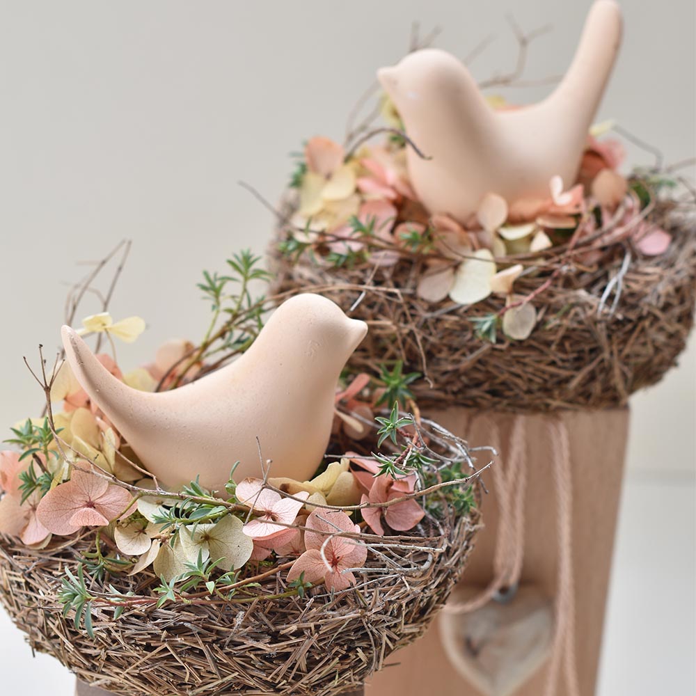Natúr madárkás tavaszi asztaldísz fa talpon, szárított virágokkal díszített fészekben.