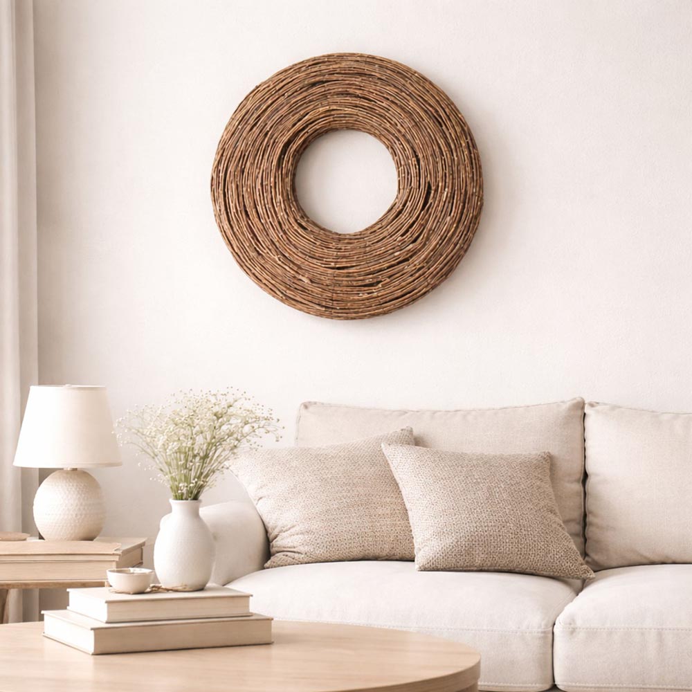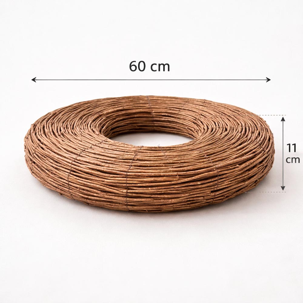 60 cm-es, vastag natúr vessző koszorú alap, amely látványos ajtó- és faldekorációk tökéletes kiindulópontja.