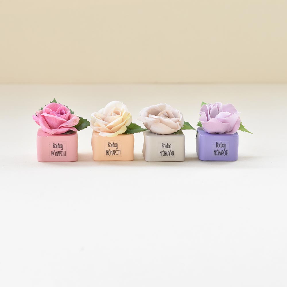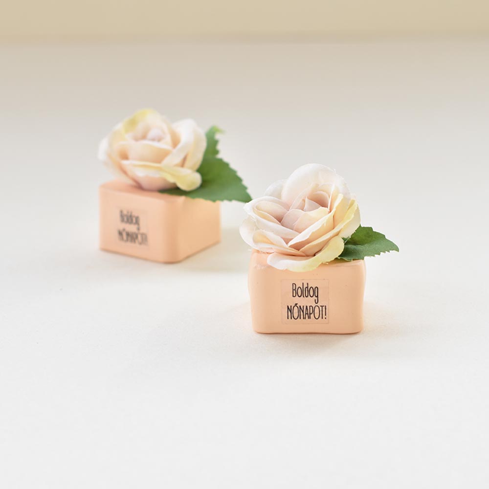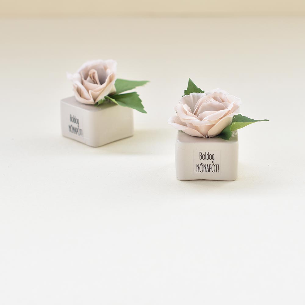Letisztult megjelenésének köszönhetően céges ajándékként is kiváló választás, hiszen elegáns, időtálló, és nem igényel gondozást. A mini kaspóban elhelyezett mű rózsafejet egy kis tillandszia egészíti ki, a kompozíciót pedig egy „Boldog nőnapot!” feliratú biléta teszi teljessé.