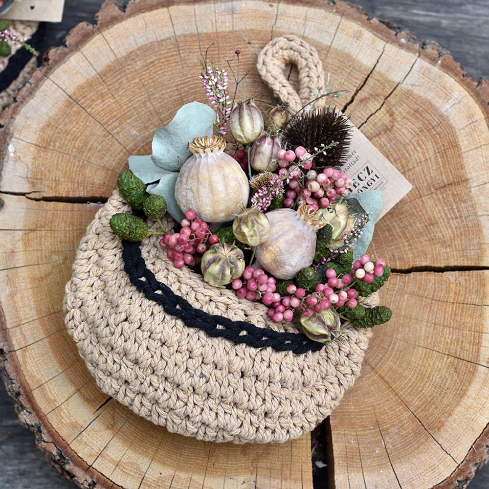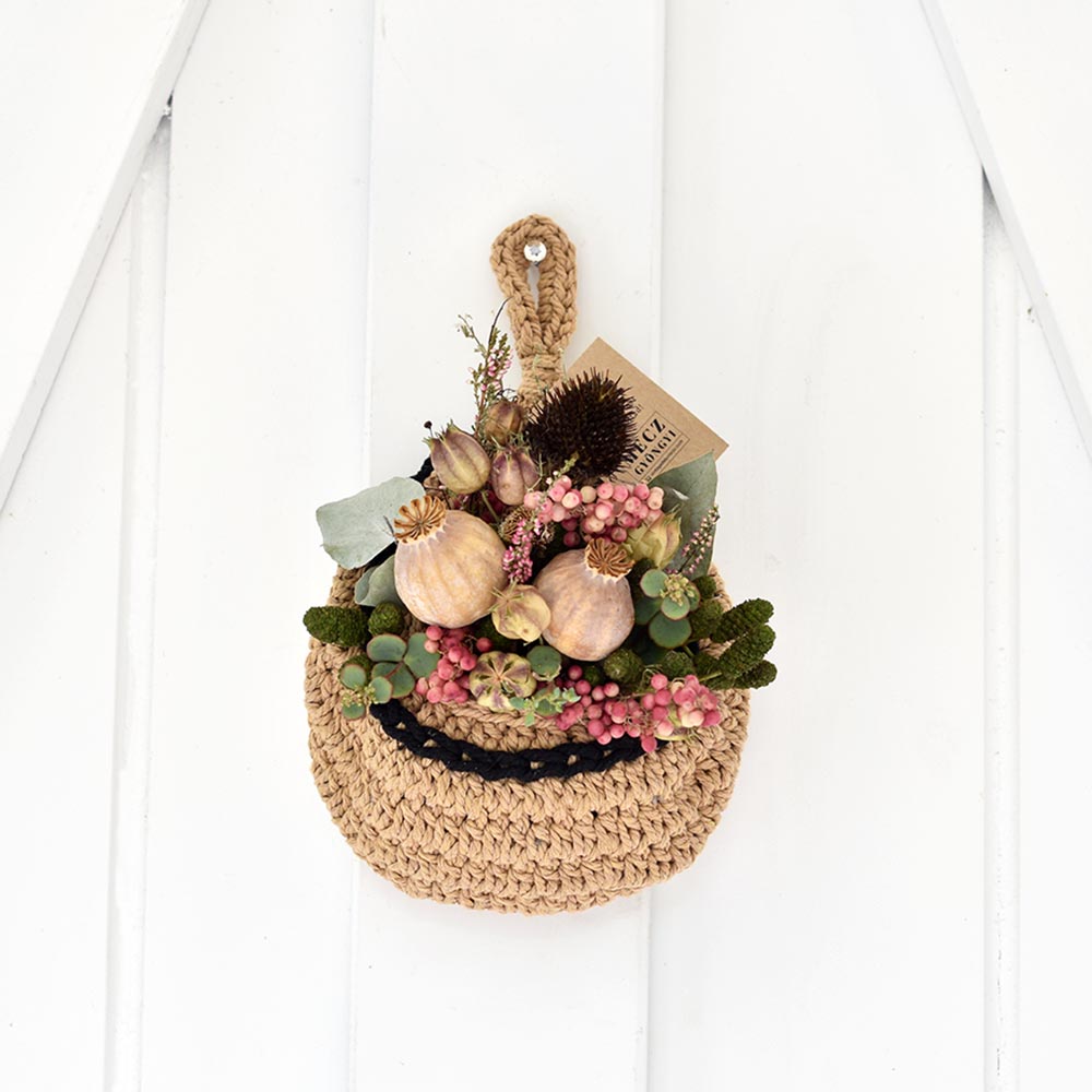 Őszi horgolt kosár virágkompozícióval – ajtó- és falidísz