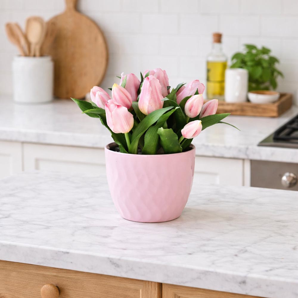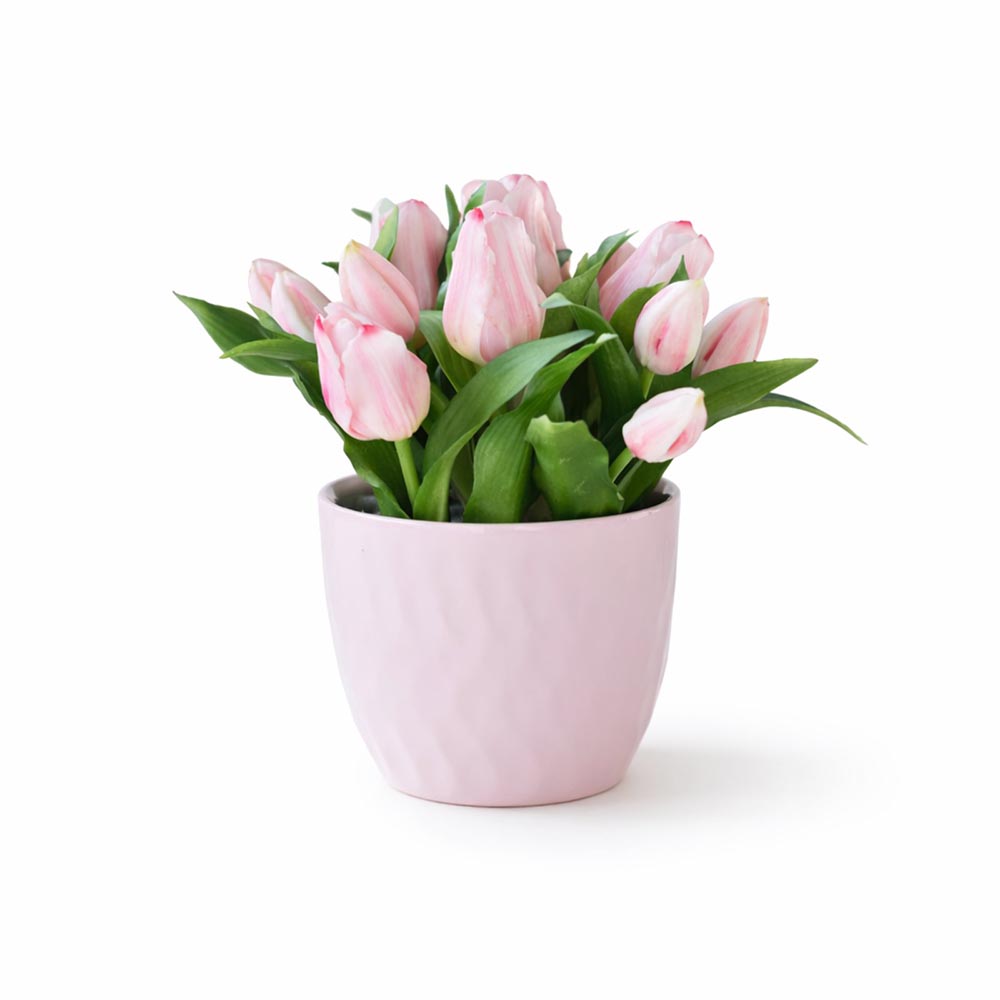 Dobd fel otthonod hangulatát ezzel az élethű, pasztell rózsaszín tulipáncsokorral, amely elegáns kerámia kaspóban érkezik! A letisztult, tavaszias megjelenésű dekoráció tökéletes választás lehet húsvétra, anyák napjára, vagy bármely évszakos lakásdekorációhoz. A virágok nem hervadnak el, így hosszan élvezheted a friss virágok hatását gondozás nélkül. A lágy rózsaszín árnyalat és a kerámia kaspó harmonikusan illeszkedik a skandináv, modern és vintage enteriőrökbe is.