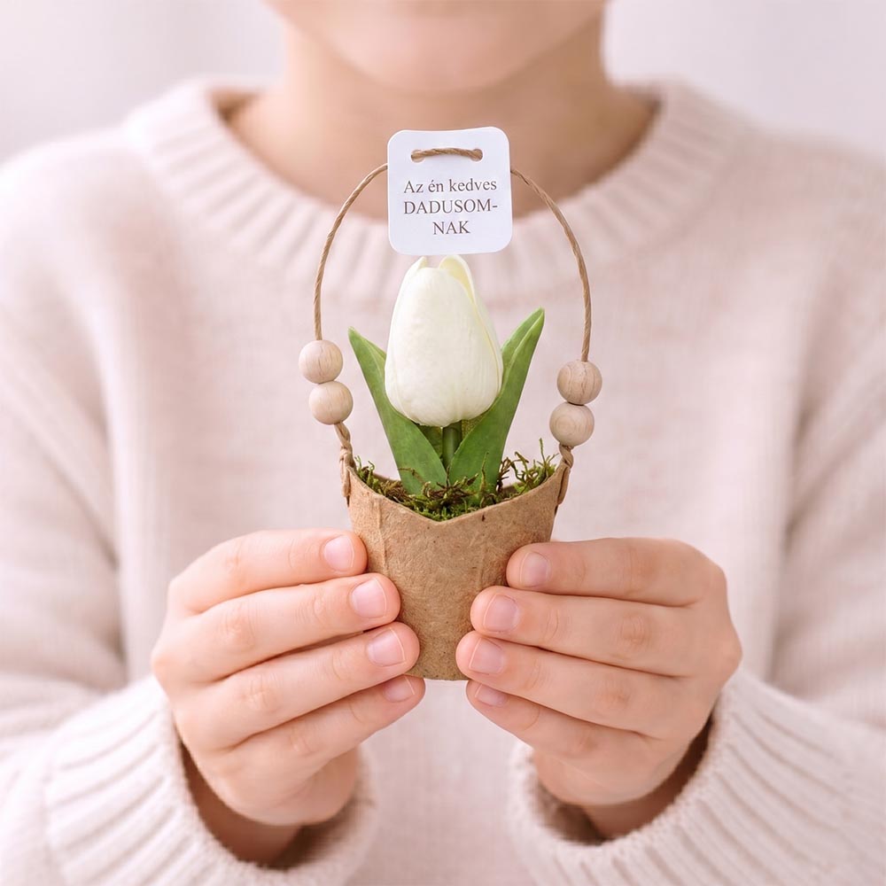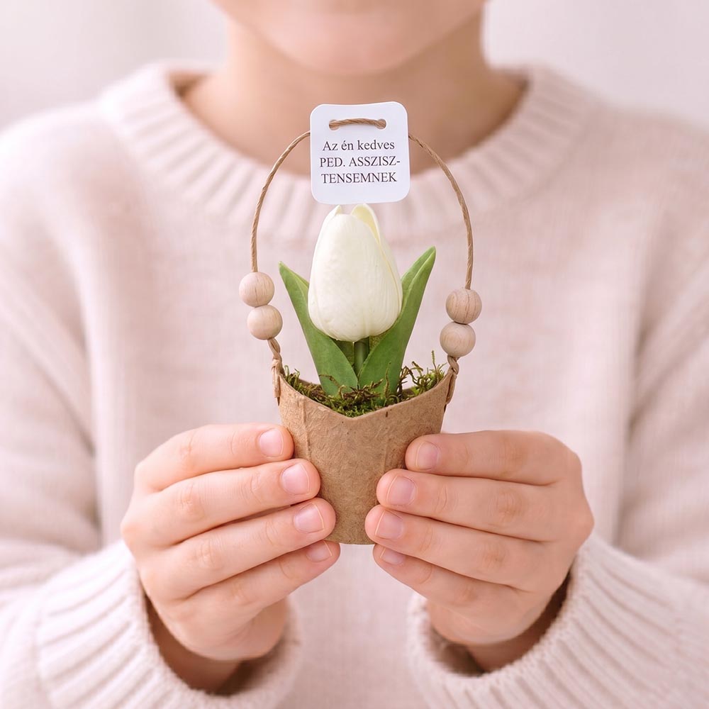 Ez a természetes hatású, kis méretű ECO kaspós virágdísz tökéletes választás, ha egy egyedi ballagási ajándékot keresel pedagógusoknakl. A dekoráció alapja egy barna kaspó, amelyet élethű mohával töltöttünk fel, és egy gyönyörű fehér tulipánnal egészítettünk ki. A fogantyú részét bájos fa golyók és egy biléta díszíti, amelyen szeretetteljes felirat olvasható: „Az én kedves óvó nénimnek”, „tanítónénimnek”, „dadusomnak”, „tanárnőmnek” vagy „pedagógiai asszisztensemnek”.