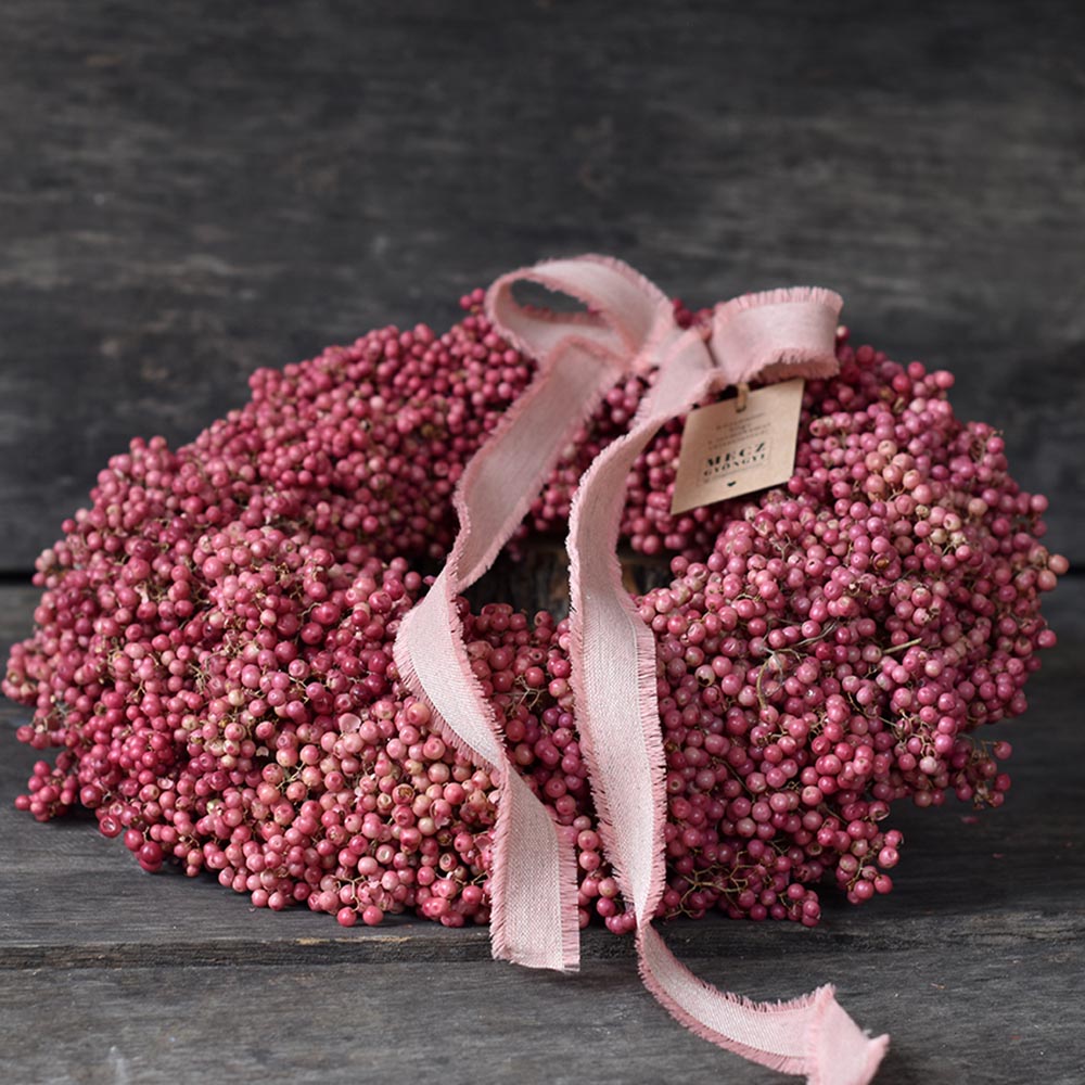 Ez a különleges, kézzel készült rózsabors koszorú igazi stílusos kiegészítő otthonodba. A koszorút teljes egészében a gazdagon elrendezett, apró rózsaszín bogyók alkotják, amelyek természetes bájt és letisztult eleganciát sugároznak.