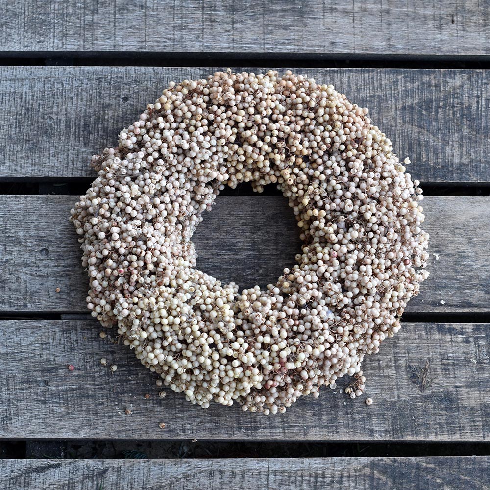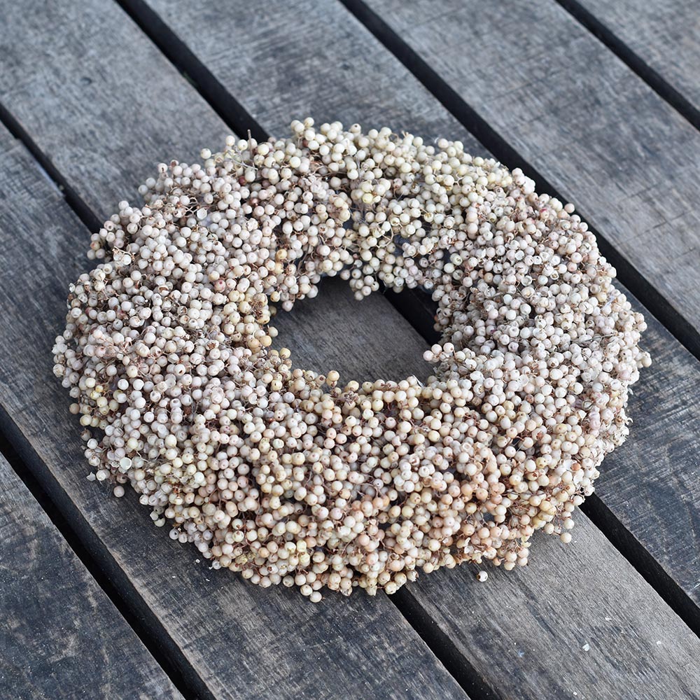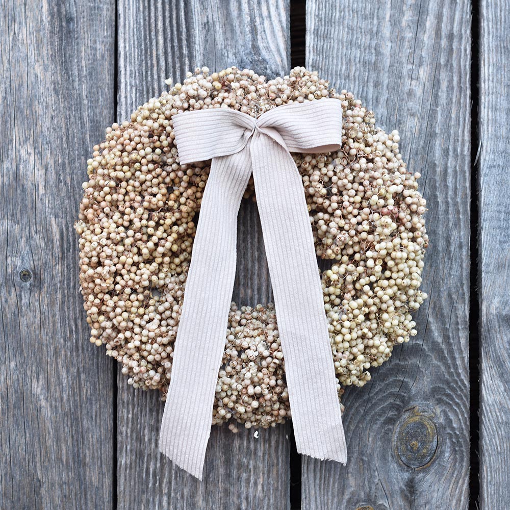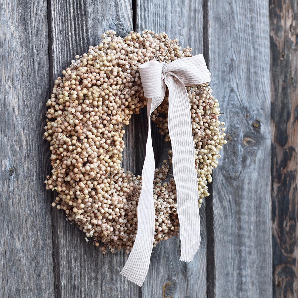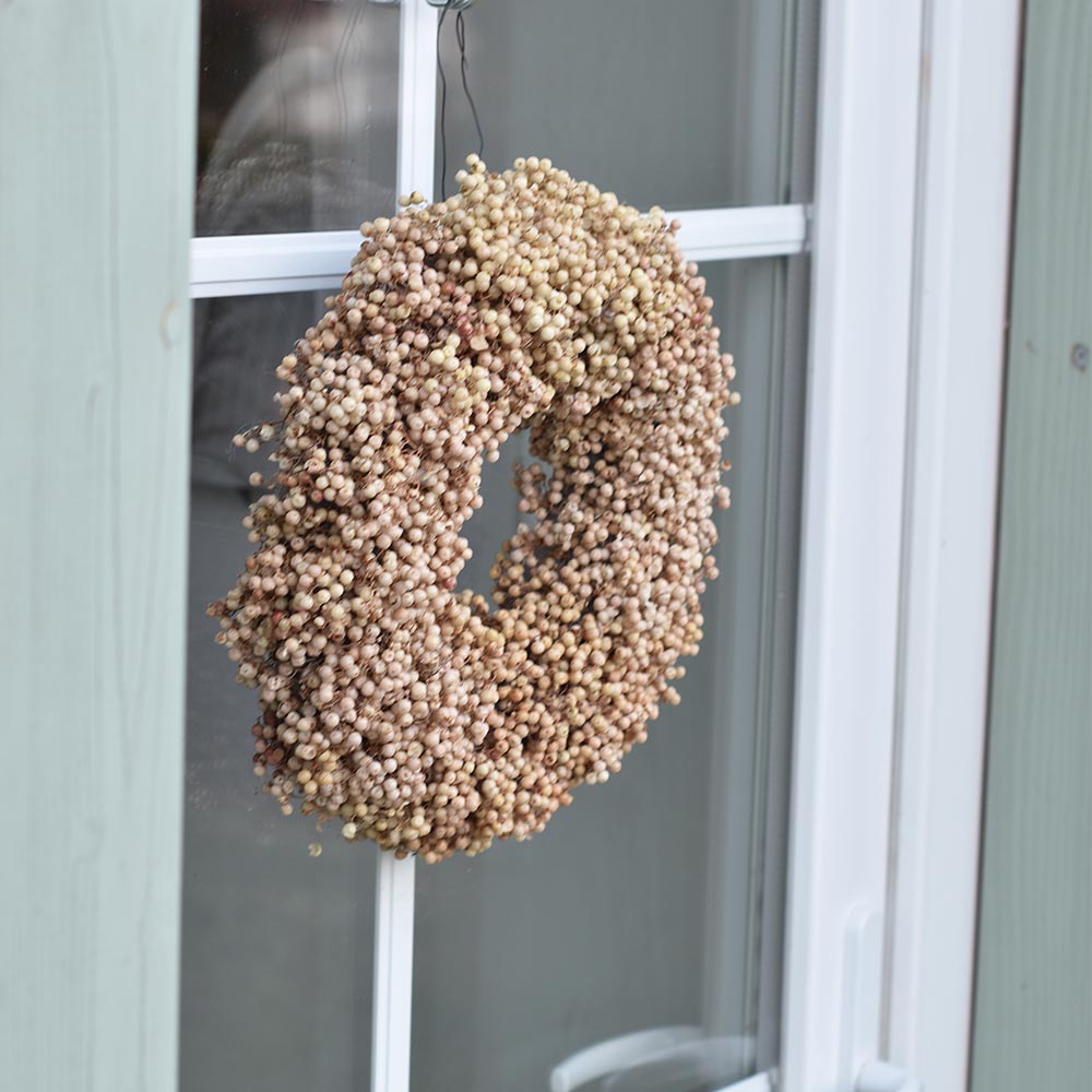 Ez a rózsabors koszorú letisztult formavilágával és természetes színeivel az időtálló dekorációk kedvelőinek készült. A sűrűn elrendezett rózsabors szemek különleges textúrát adnak a koszorúnak, miközben visszafogott, elegáns összhatást teremtenek.