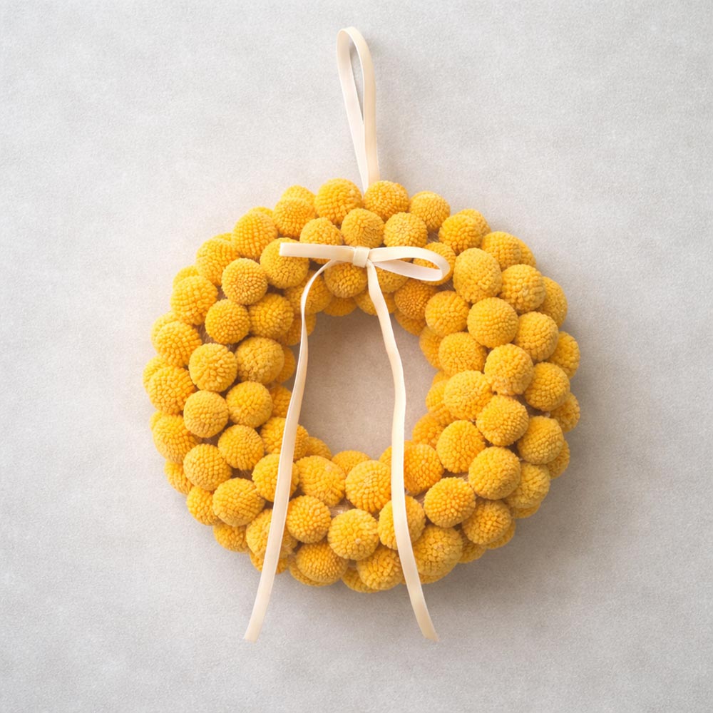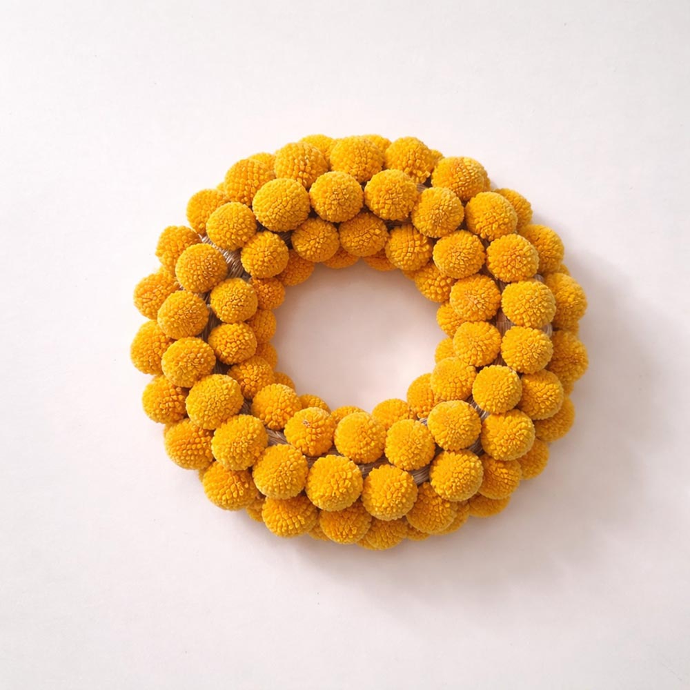 Vidám, napsárga craspedia virágokból készült, kézműves ajtódísz, amely meleg és hívogató hangulatot teremt otthonodban.