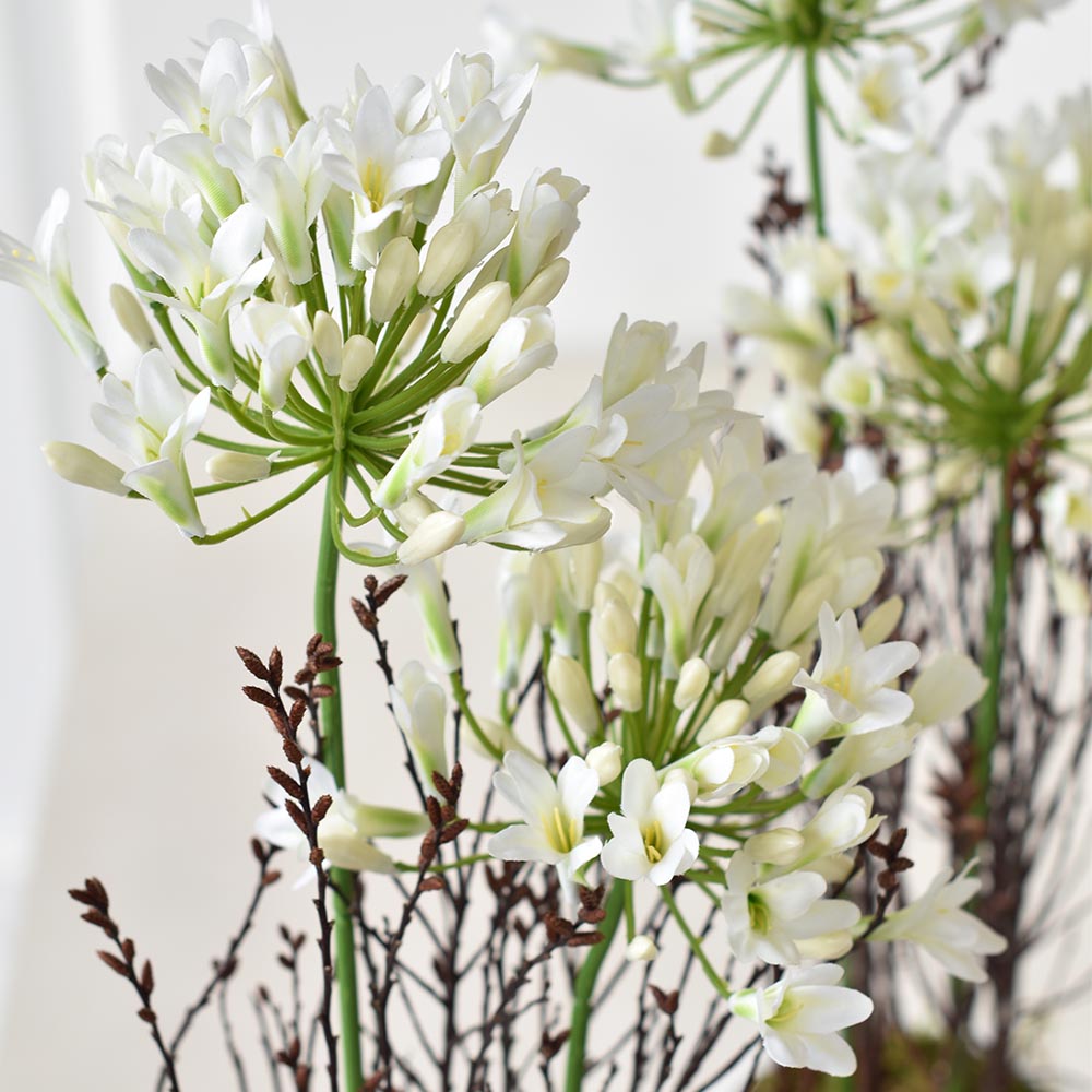 Ez a különleges szerelemvirág (agapanthus) dekoráció kaspóban egy elegáns és letisztult tavaszi lakásdísz, amely természetes hangulatot visz bármely enteriőrbe. A fehér virágok légies megjelenése és a finom ágak harmonikus kompozíciója modern, mégis barátságos atmoszférát teremt otthonodban.