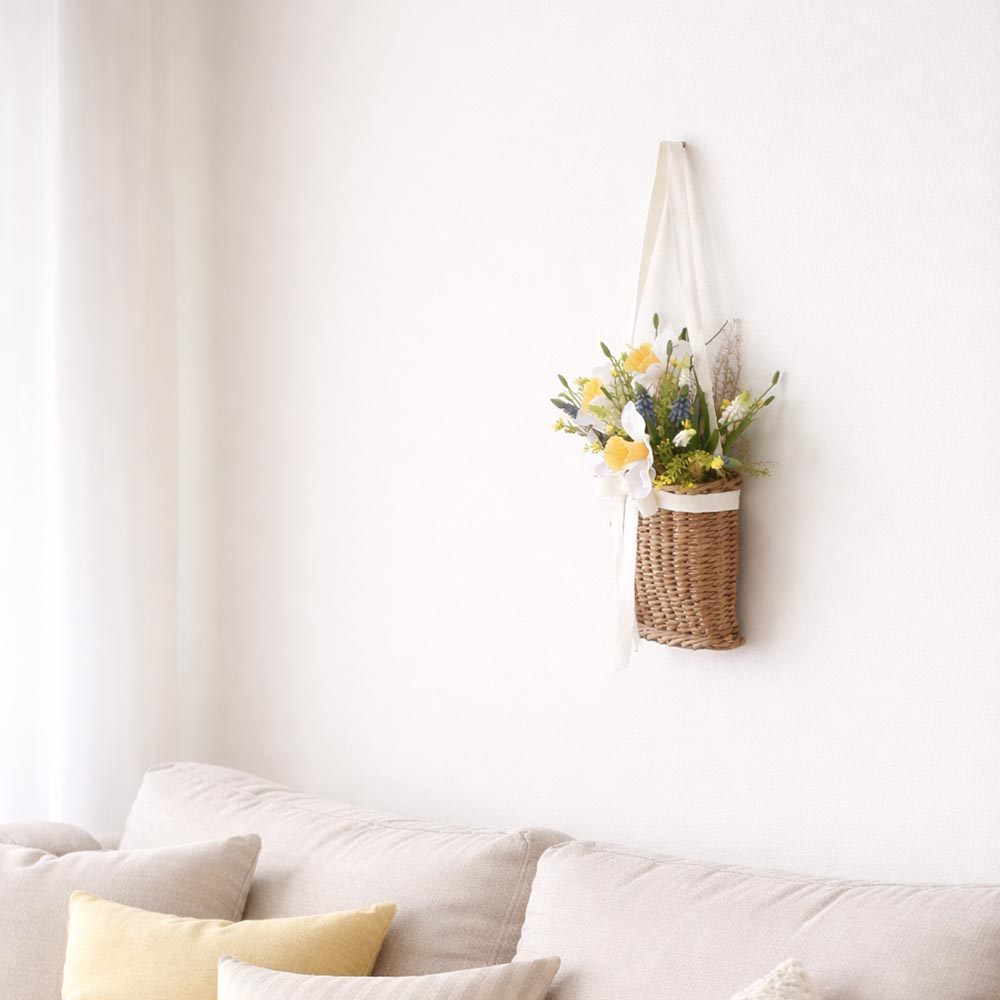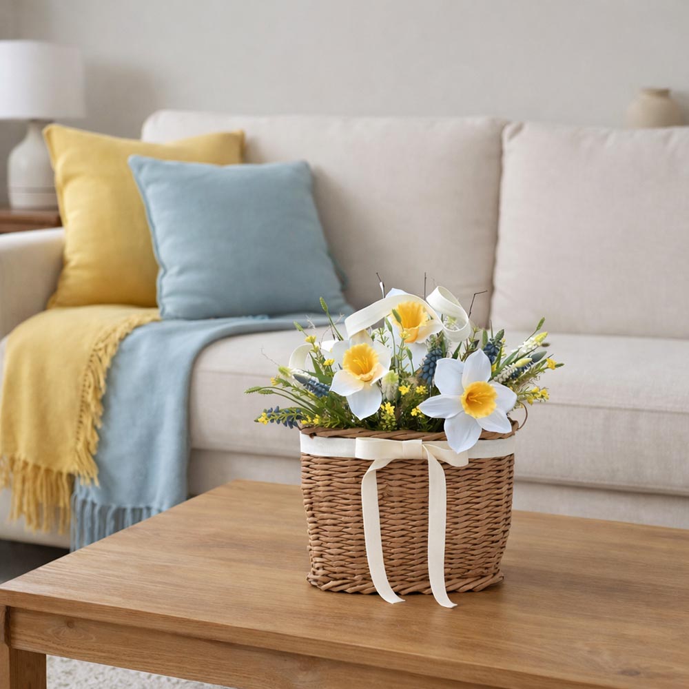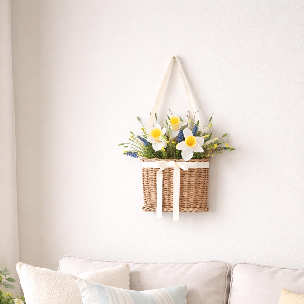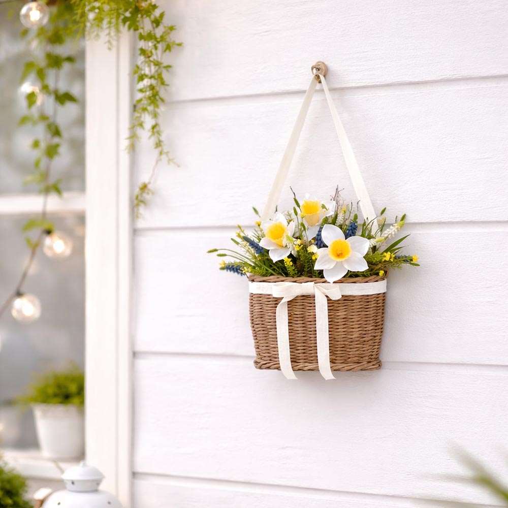 Tavaszi fonott kosaras nárcisz és gyöngyike dekoráció, amely frissességet és vidámságot varázsol otthonodba ajtódíszként vagy asztali dekorációként.