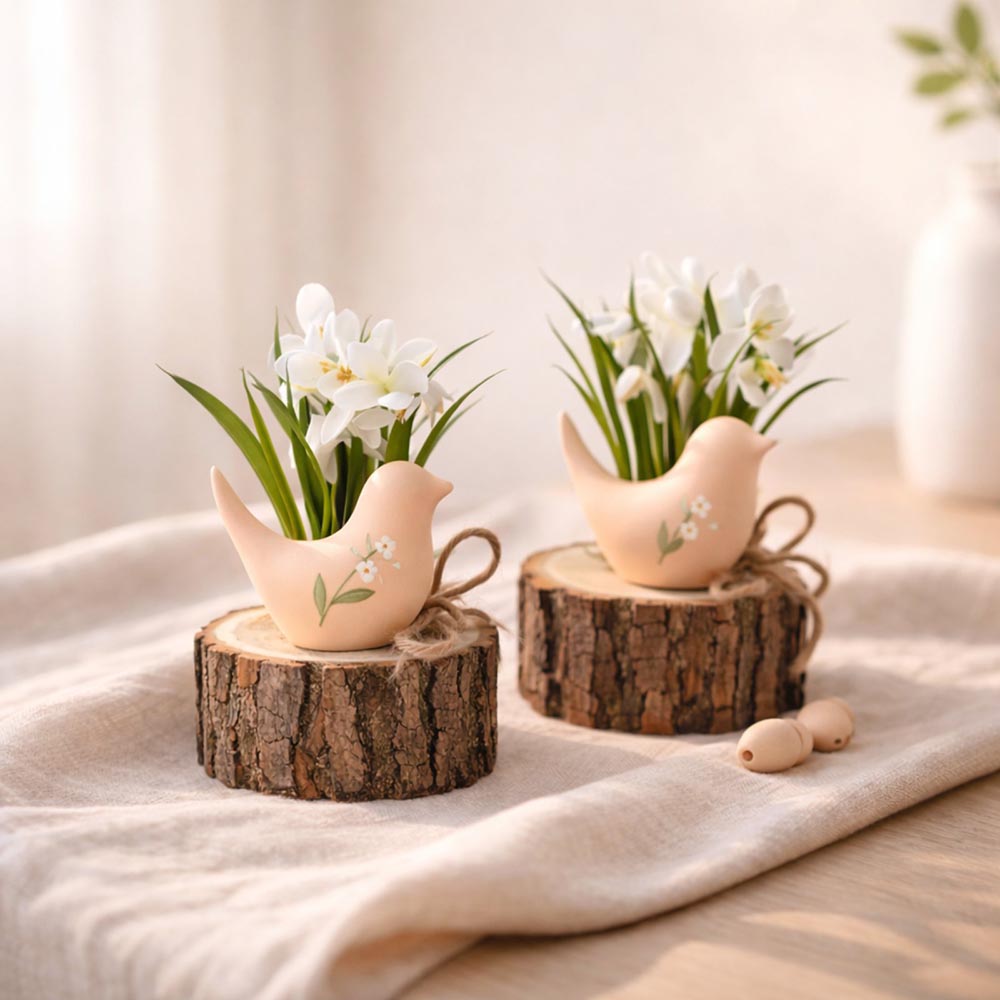 Ez a tavaszi asztaldísz hóvirággal a természet ébredésének finom hangulatát hozza el otthonodba. A dekoráció alapját egy natúr fakorong adja, amelybe egy apró nyílásban kap helyet a gondosan elrendezett mű hóvirág. A fakorong szélén elhelyezett kis madárka kedves, tavaszias részletként teszi teljessé az összhatást.