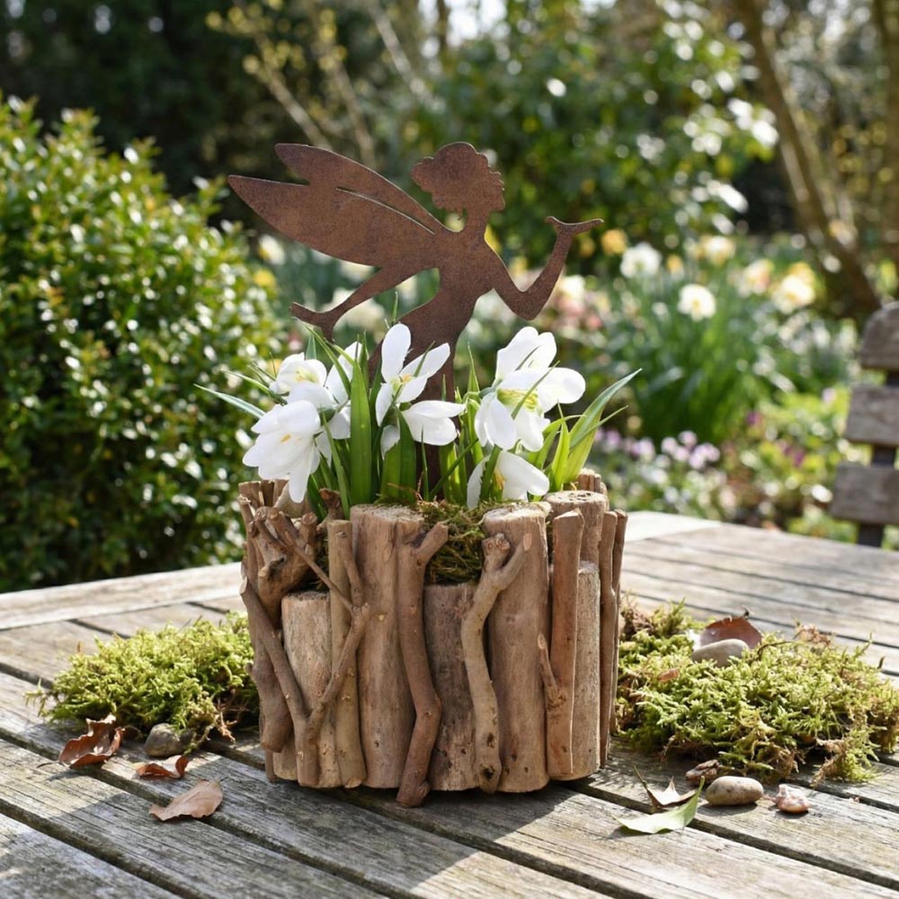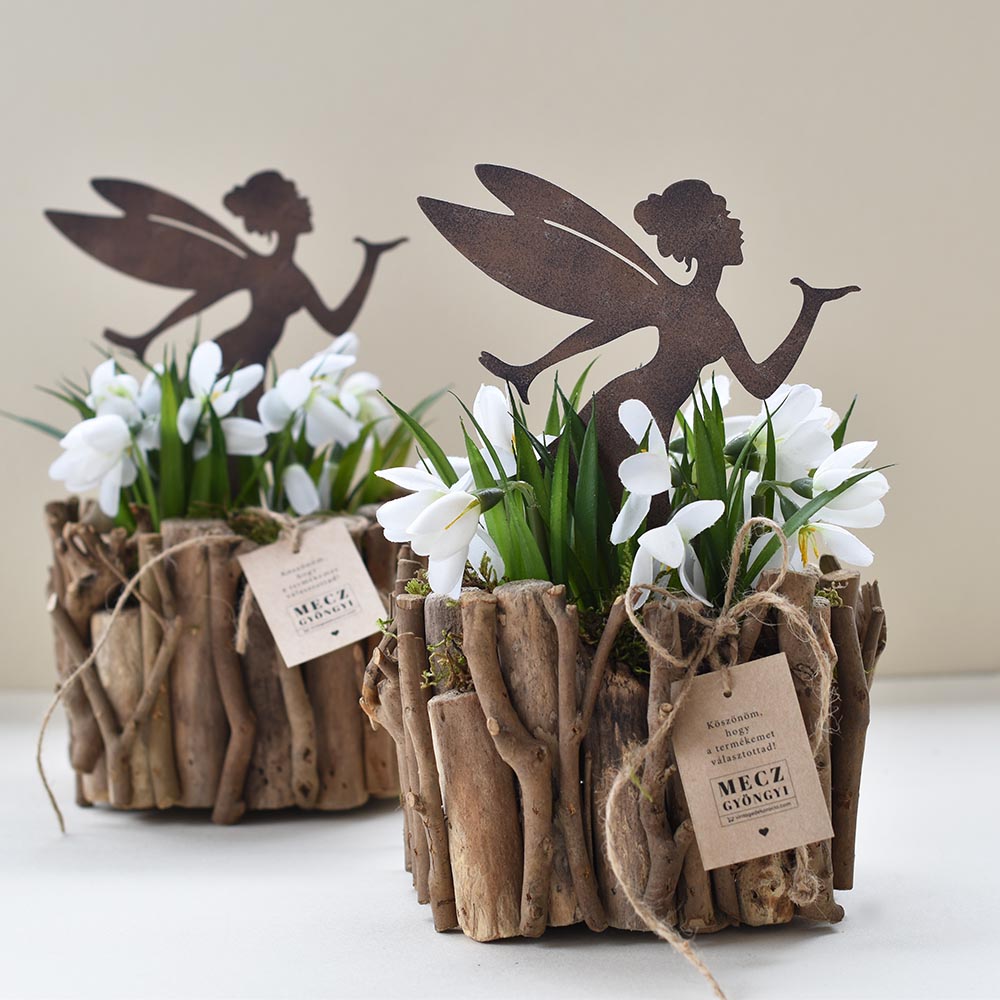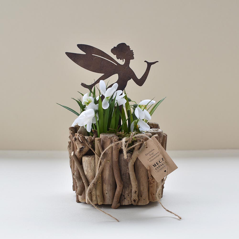 Ez a tavaszi asztaldísz hóvirággal igazi természetközeli hangulatot varázsol otthonodba. A négyzet alakú, fa ágakból készült kaspó rusztikus és letisztult megjelenést ad a kompozíciónak, amelyben moha, élethű hóvirágok és egy különleges, rozsdás hatású tündér figura kapott helyet.